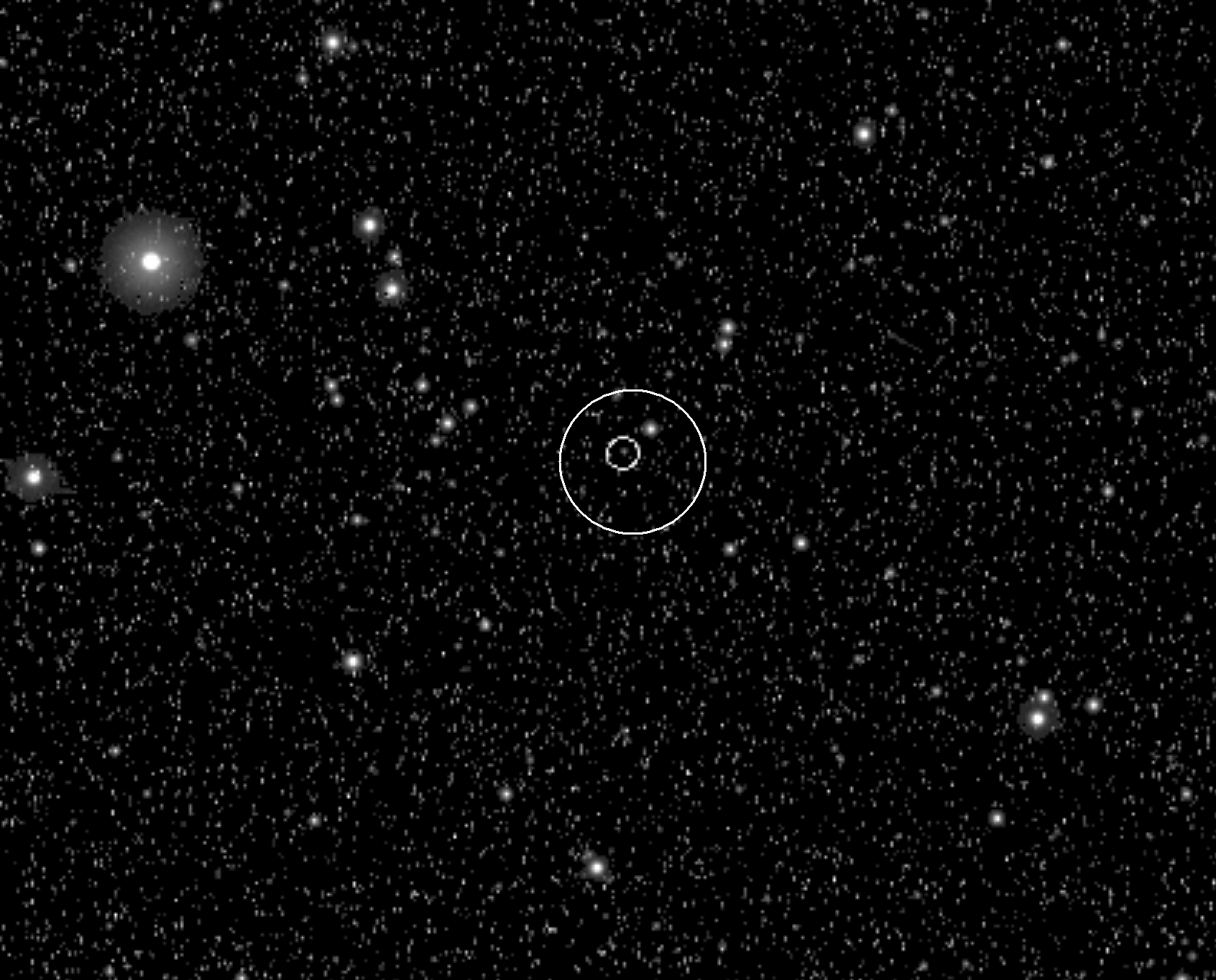 On this day, the asteroid was still fainter than the nominal detection limit of the camera. The larger surrounding white spots are stars. Almost all other small white spots are artefacts from the camera's CCD sensor (known as pixel dark current), which considerably degrades the quality of the image. The asteroid was found within 3 arcseconds of its predicted position.