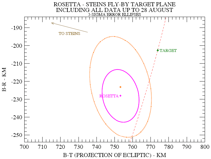 This plot shows the situation in the target plane for the Rosetta fly-by of asteroid Steins. It is based on the optical navigation data as well as all radiometric data (spacecraft tracking) and ground-based astrometric data up to and including 28 August 2008.