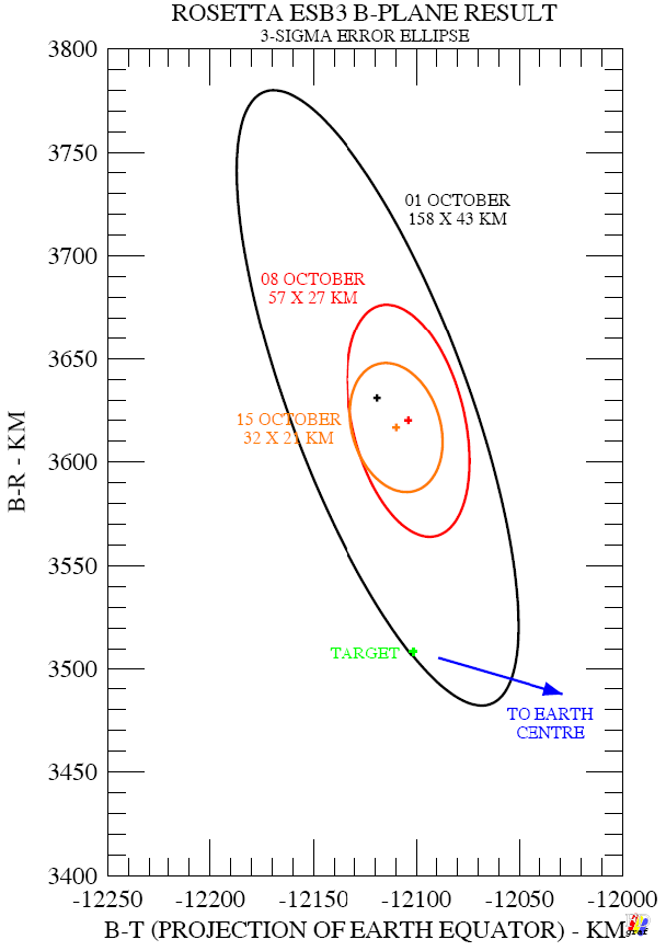 Based on radiometric data from the navigation campaign the Rosetta flight dynamics team has determined solutions for the spacecraft's predicted incoming trajectory in the B-plane. Three successively more accurate determinations of the predicted point relative to the target were obtained using data up to 1 October (black), 8 October (red) and 15 October (orange). For each date the associated 3-sigma error ellipse is also given.