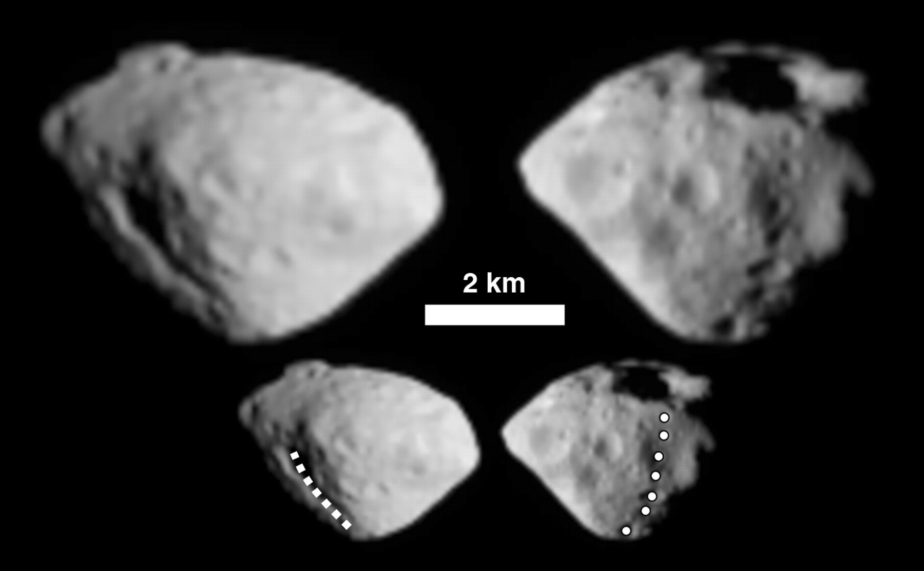 The WAC image (top right) taken around CA at a phase angle of 61.5° shows the surface of Steins at a resolution of 80 m/pixel. The NAC image (top left) taken 10 min before CA has a slightly lower resolution of 100 m/pixel. The scale is given by the 2-km bar. The difference in viewing angle between the images is 91°, so they show opposite sides of the body. Celestial north is up. A large crater is visible near the south pole; Steins's rotation is retrograde and therefore its north pole points toward the celestial south according to IAU rules. The positions of the catena with the seven pits (bottom right image) and of the large fault on the opposite side (bottom left image) are indicated.
