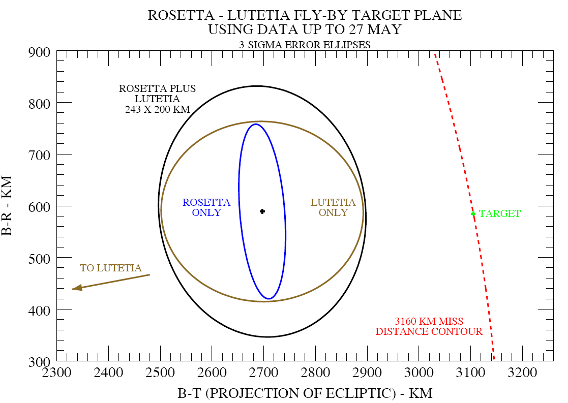 This plot shows the situation in the target plane for Rosetta's flyby of asteroid Lutetia on 10 July 2010. The target plane is a planar coordinate system centred on the asteroid and is used for targeting during this close flyby. The target relative position of Rosetta for the flyby is marked in green and is 3160 km from asteroid Lutetia (at the origin of the plot, direction indicated with arrow).