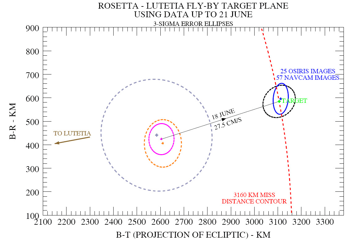 The blue cross and associated error ellipse is the new solution in the target plane, after the TCM, based on the navigation data up to 21 June. Rosetta's projected position in the target plane now lies 3169 km from Lutetia and only 13 km from the target. The ellipse has semi-axes of 66 × 32 km. The predicted time of closest approach is 15:44:55.51 UTC with a 3-sigma uncertainty of 7.43 seconds.