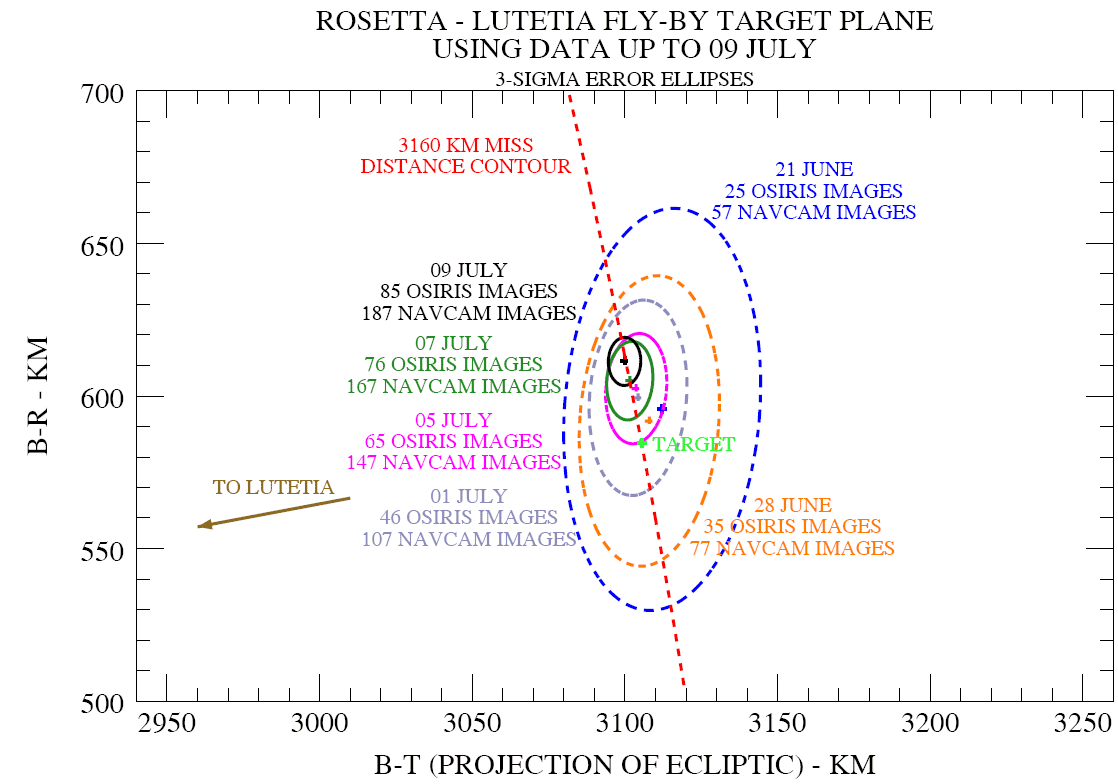 Rosetta's projected position in the target plane now lies 3160 km from Lutetia and 27 km from the target. The error-ellipse has semi-axes of 7.9 × 5.3 km. The predicted time of closest approach is 15:44:57.25 UTC with a 3-sigma uncertainty of 7.17 seconds.