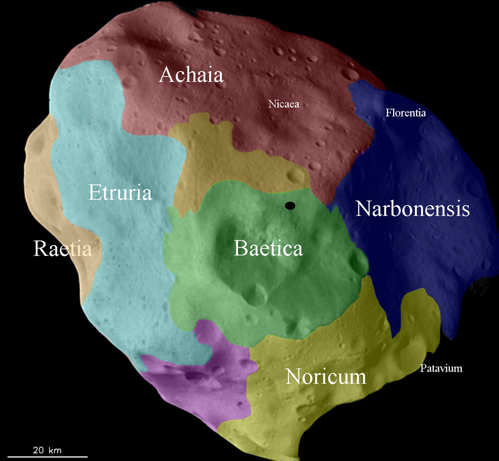 The most ancient portions on the surface of Lutetia are the heavily cratered Achaia and Noricum regions, shown in red and yellow in the upper and lower part of the image, respectively. With ages between 3.4 and 3.7 billion years or more, these two regions are almost as old as the asteroid itself.