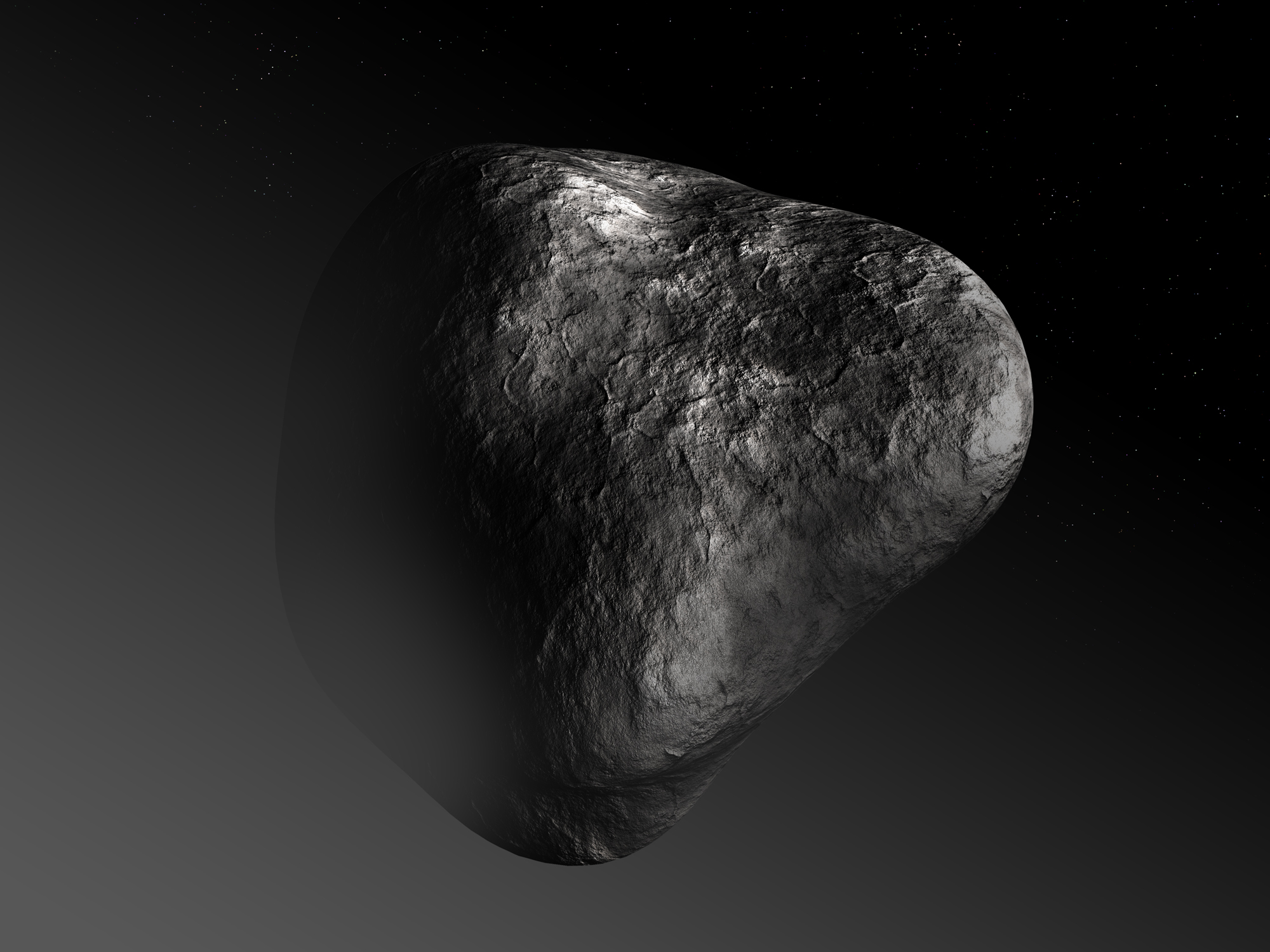 Artist's impression of the nucleus of comet 67P/Churyumov–Gerasimenko, portrayed far from the Sun with little to no activity. Comets are a mix of rock, dust, ice and organic materials, and their surfaces are very dark, typically reflecting only 4 per cent of the light that falls on them. Some parts of the nucleus are smooth and young, while other areas are cratered and old. The smoother, brighter areas of a nucleus are a result of resurfacing processes during active phases of the comet. That is, when its surface is heated up close to the Sun, ices sublimate and gases escape from inside the nucleus, creating a dynamic and unpredictable environment. Comet 67P/Churyumov–Gerasimenko is thought to be about 4 km wide, but until Rosetta reaches it in 2014, exactly what the nucleus looks like remains a mystery.