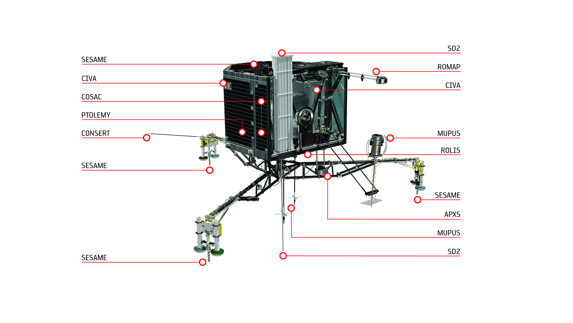 Rosetta will deploy the Philae lander to the surface of comet 67P/Churyumov-Gerasimenko for in situ analysis with its 10 instruments: