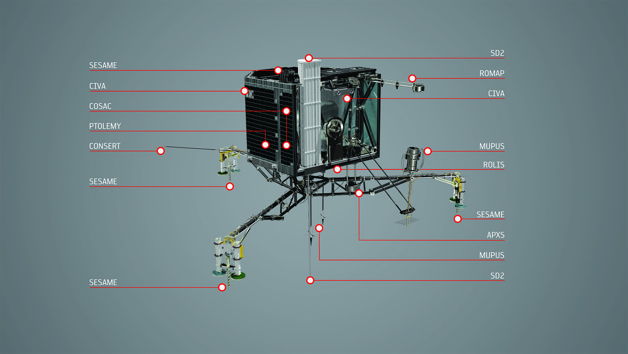 Rosetta will deploy the Philae lander to the surface of comet 67P/Churyumov-Gerasimenko for in situ analysis with its 10 instruments: