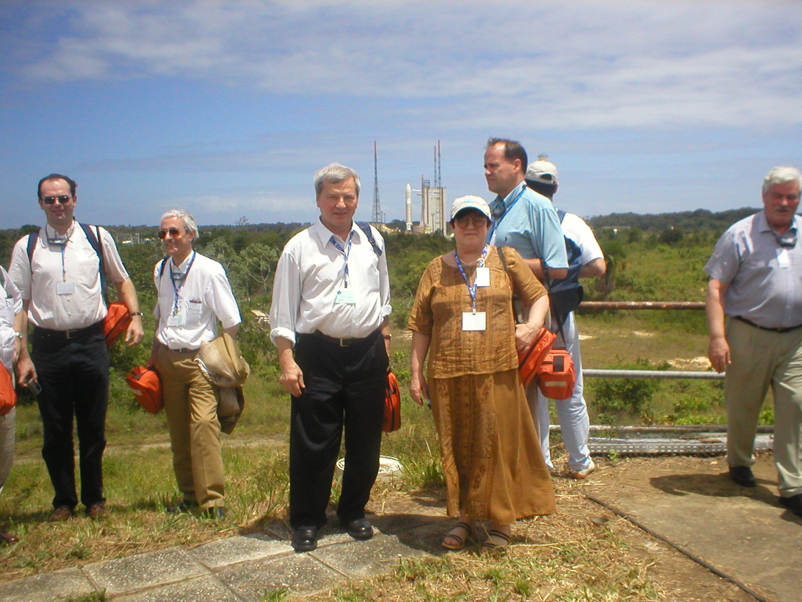 Svetlana Gerasimenko and Klim Churyumov in Kourou just before the launch of the Rosetta spacecraft in March 2004. The Ariane rocket which launched Rosetta can be seen in the background.