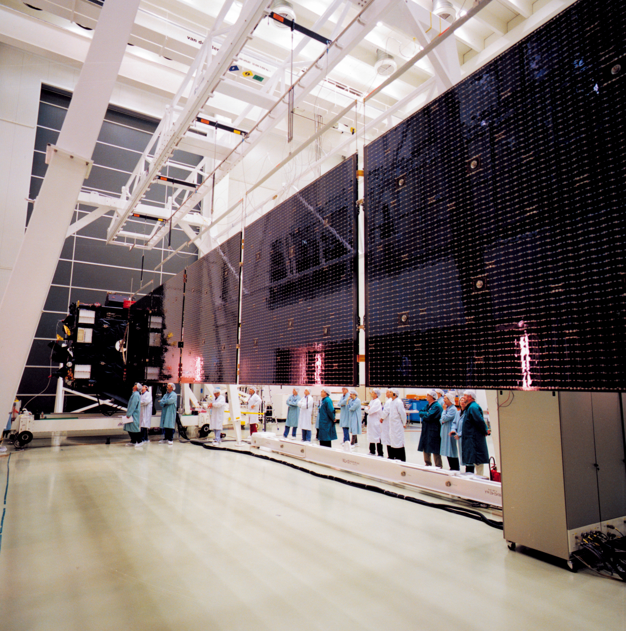 One of Rosetta's two 14m-long solar array wings is seen in this photo, fully deployed and supported by an overhead rig. Each wing comprises 5 large solar panels and the combined surface area of the two solar array wings is 64 m².