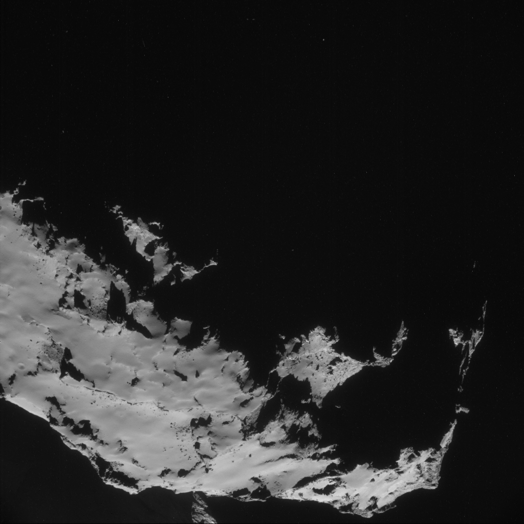 Full-frame Rosetta navigation camera (NAVCAM) image taken on 10 September 2014 at a distance of 27.8 km from the centre of comet 67P/Churyumov-Gerasimenko.
