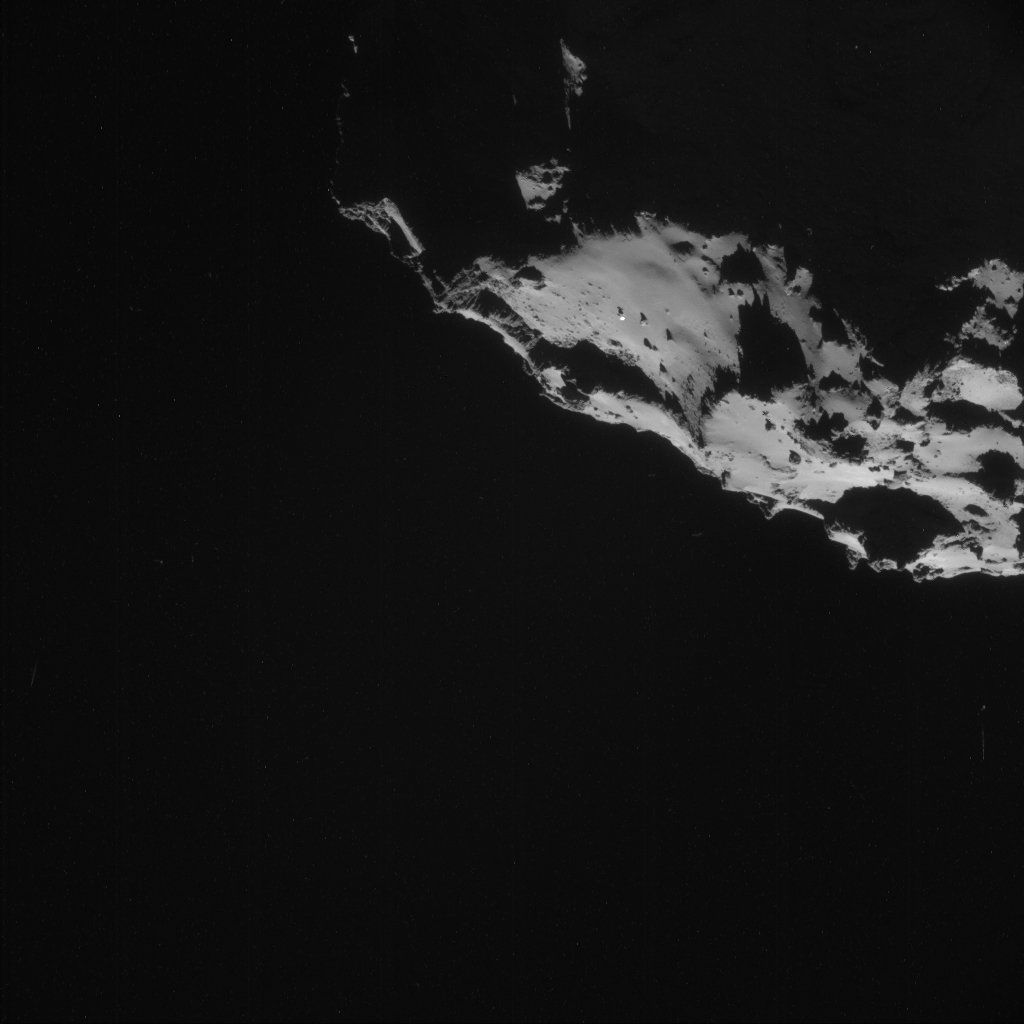 Full-frame Rosetta navigation camera (NAVCAM) image taken on 10 September 2014 at a distance of 27.8 km from the centre of comet 67P/Churyumov-Gerasimenko.