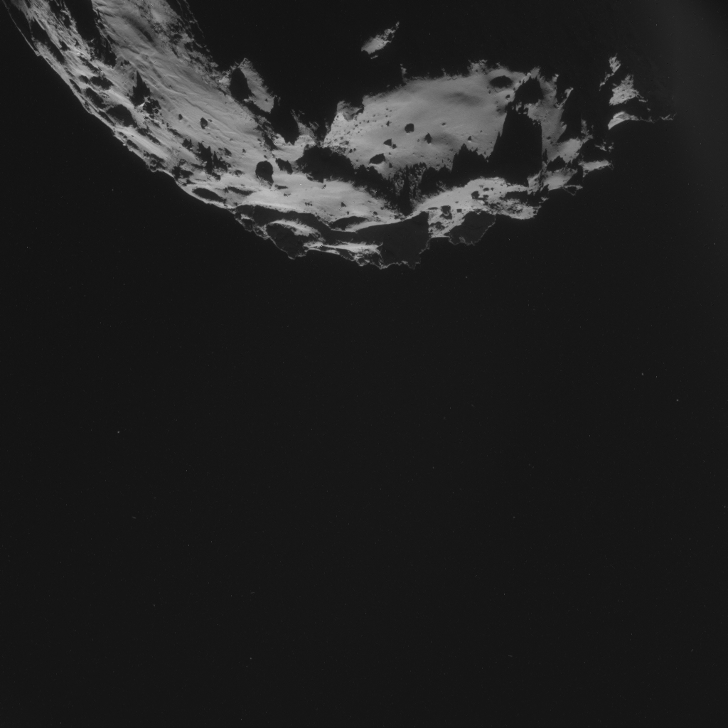 NAVCAM image sequences are now being taken as small 2×2 rasters, such that roughly one quarter of the comet is seen in the corner of each of the four images. A montage of all four images from this sequence is available here and clearly shows the spectacular region of activity at the 'neck' of the comet. This is the product of ices sublimating and gases escaping from inside the comet, carrying streams of dust out into space.