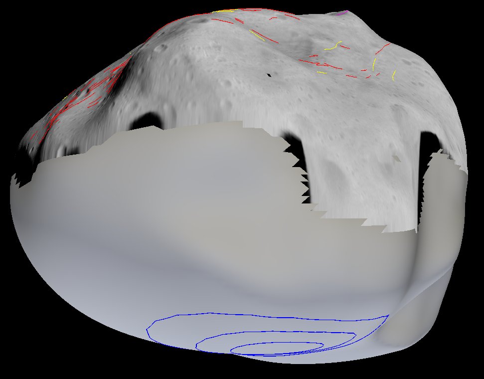 The inferred location of Suspicio crater on the unseen southern hemisphere of asteroid Lutetia (marked in blue). The hidden crater could be up to 45 km in diameter – the blue outlines correspond to diameter estimates of 15, 30 and 45 km, respectively. The crater is inferred based on the numerous grooves or ‘lineaments’ seen concentric to the crater in the northern hemisphere of the asteroid. There are no image data available for this side of the asteroid, as can be inferred from the blank shape model.
