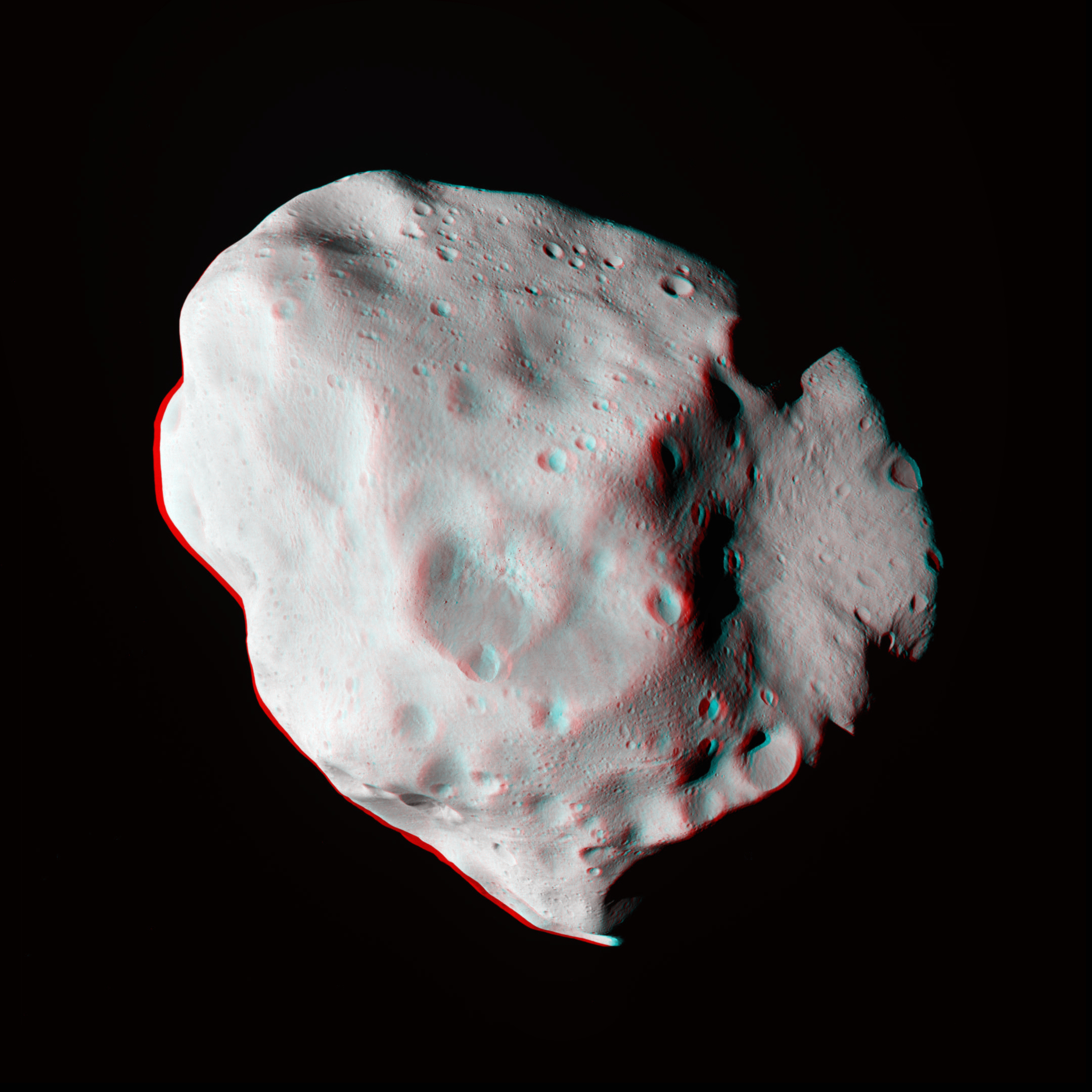 This anaglyph 3D image of Lutetia can be viewed using stereoscopic glasses with red-green or red-blue filters. The two images making up this image were taken several minutes before Rosetta's closest approach to the asteroid on 10 July 2010. The left-eye view was captured at 15:41:39 GMT from a distance of 4274 km from Lutetia's surface and the right-eye view at 15:42:03 GMT from 4038 km (closest approach was at 15:45 GMT).
