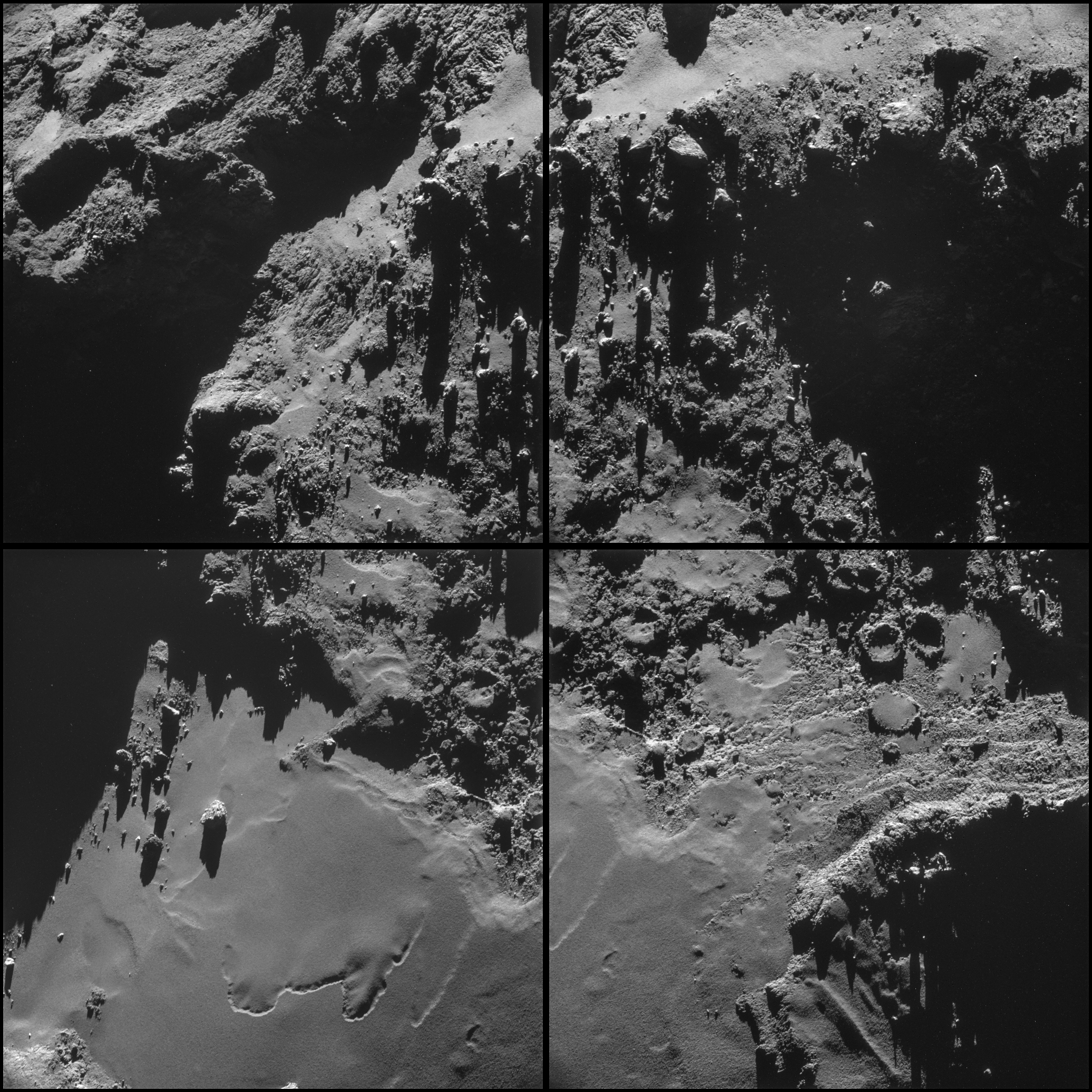 Montage of four images taken by Rosetta's navigation camera (NAVCAM) on 18 October 2014 at 9.9 km from the centre of comet 67P/Churyumov-Gerasimenko.