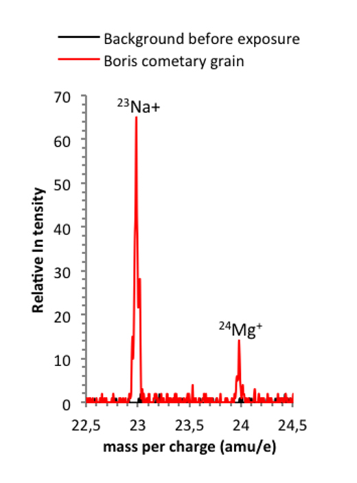 This spectrum shows the positive mass per charge from 22.5 amu/e to 24.5 amu/e obtained on 7 August 2014, before exposure of the first COSIMA target-holders (shown in black) and from the "shot and hit" grain Boris (shown in red) collected during the second exposure week (18-24 August 2014) at about 80 km from comet 67P/Churyumov-Gerasimenko. Each spectrum is the sum of two spectra taken at the same position, each taken for a period of 2.5 minutes. The two clear peaks in the red spectrum show that among the grain's components are magnesium and sodium.