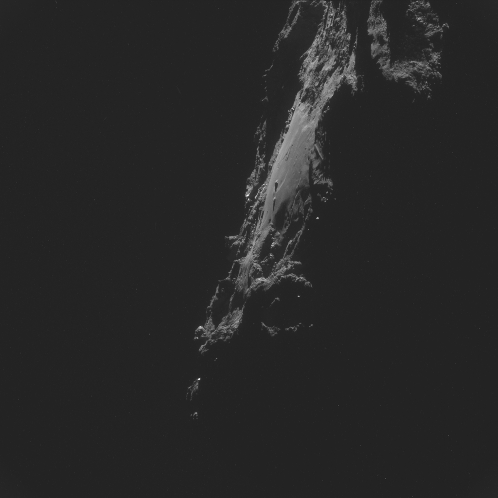 NAVCAM image sequences are now being taken as small 2×2 rasters and only part of the comet is seen in each of the four images. A montage of all four images from this sequence is available here and a mosaic of the four images stitched together is available here.