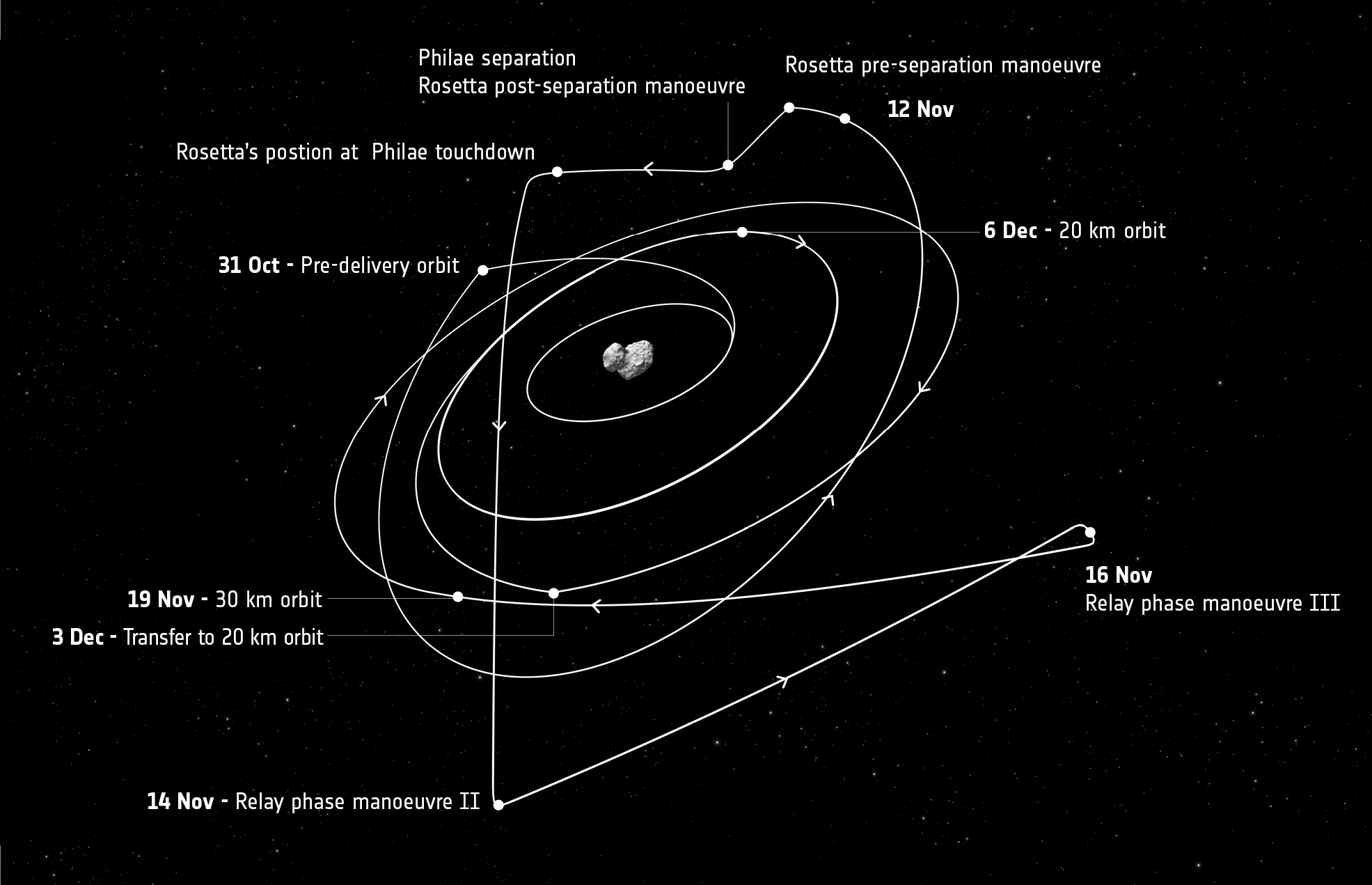 The diagram is based on the animation Rosetta: close orbits to lander deployment.