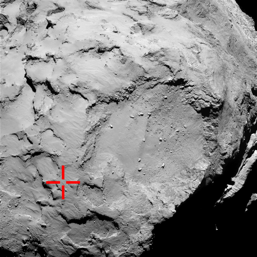 This image from Rosetta’s OSIRIS narrow-angle camera is marked to show the location of the first touchdown point of the Philae lander. It is thought that Philae bounced twice before settling on the surface of Comet 67P/Churyumov-Gerasimenko. The OSIRIS image was taken from a distance of 50 km on 2 September 2014, prior to landing.