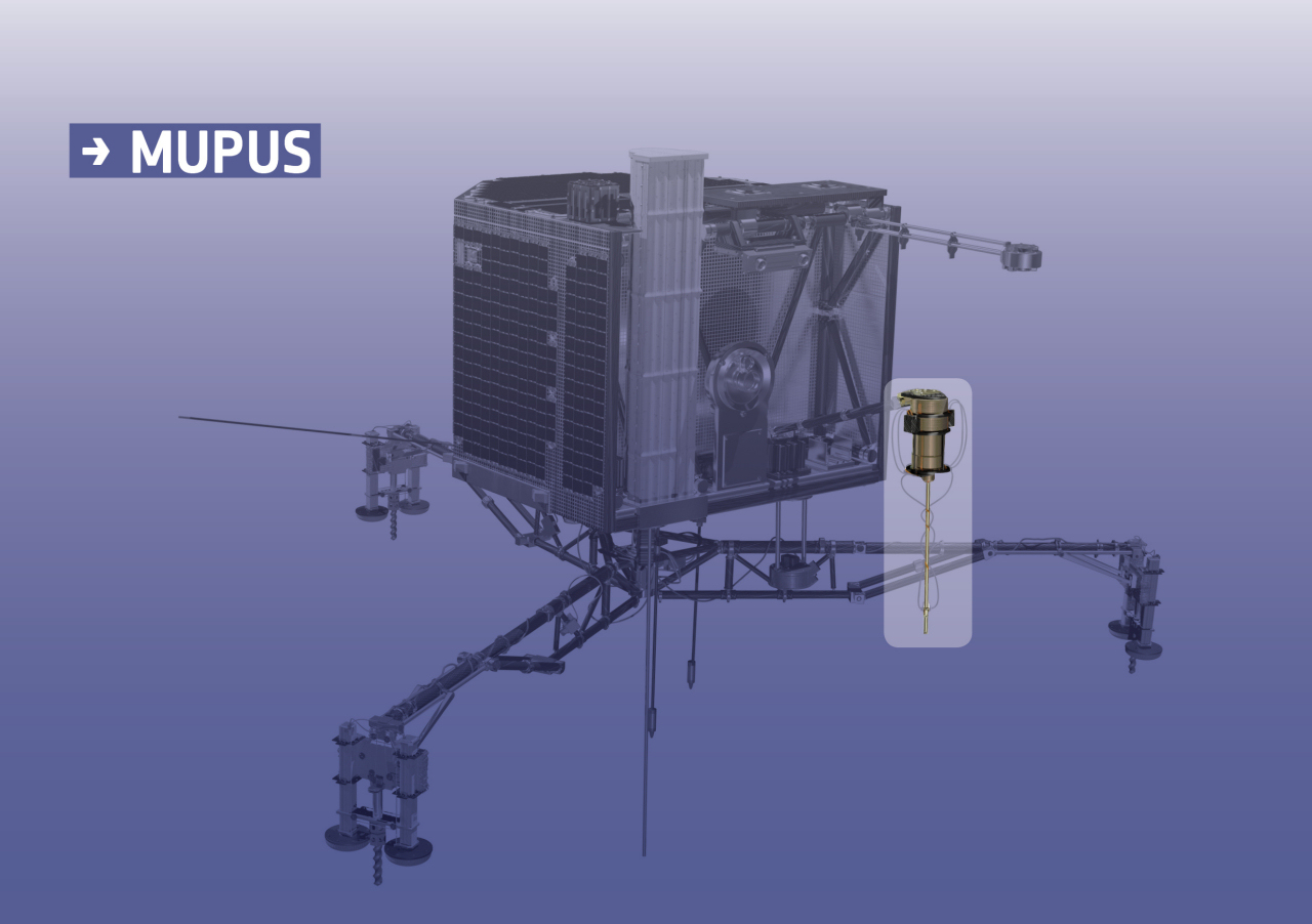 Illustration, highlighting the penetrator (pen and hammer) of the Multi-Purpose Sensors for Surface and Subsurface Science (MUPUS) instrument package on Rosetta's lander Philae.