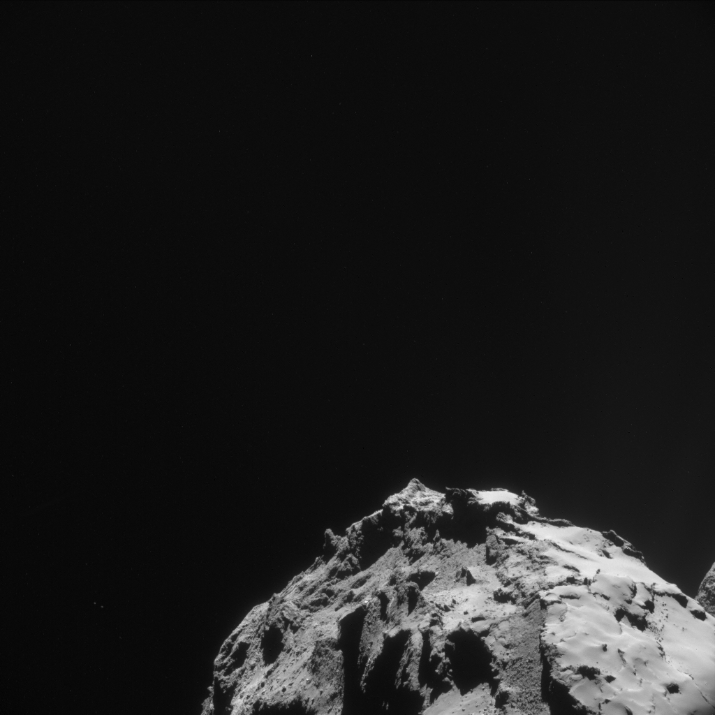 NAVCAM image sequences are now being taken as small 2×2 rasters and only part of the comet is seen in each of the four images. A montage of all four images from this sequence is available here and a stitched mosaic is available here.