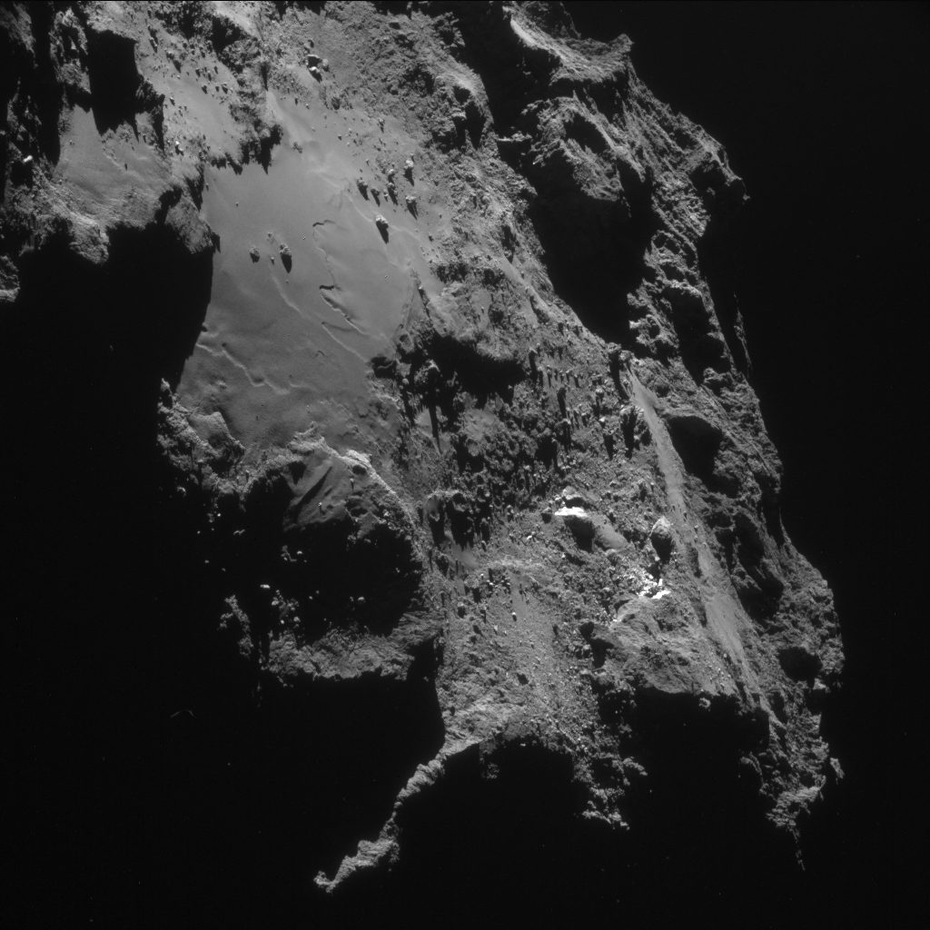 Full-frame Rosetta navigation camera (NAVCAM) image taken on 3 January 2015 at 28.4 km from the centre of comet 67P/Churyumov-Gerasimenko. The image scale is about 2.4 m/pixel.