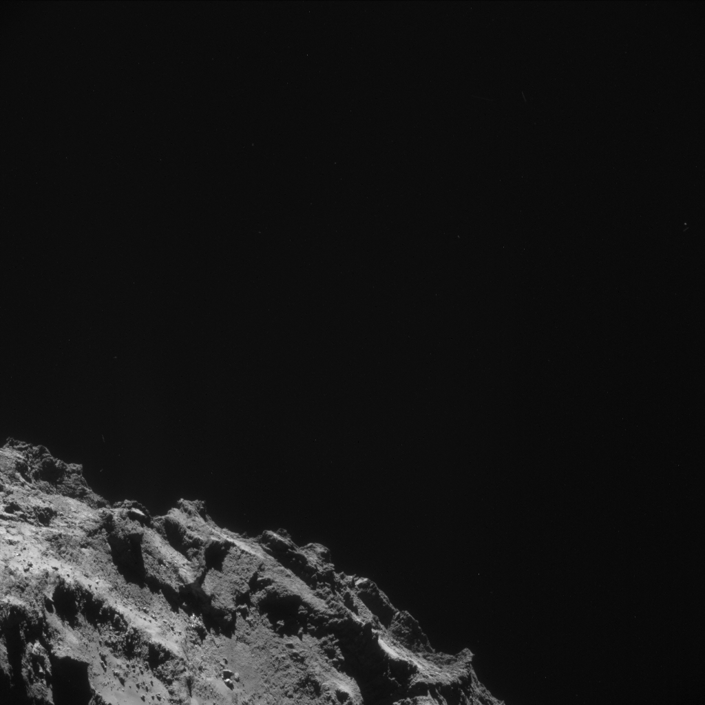 NAVCAM image sequences are now being taken as small 2×2 rasters and only part of the comet is seen in each of the four images. A montage of all four images from this sequence is available here and a mosaic of the four images stitched together is available here.