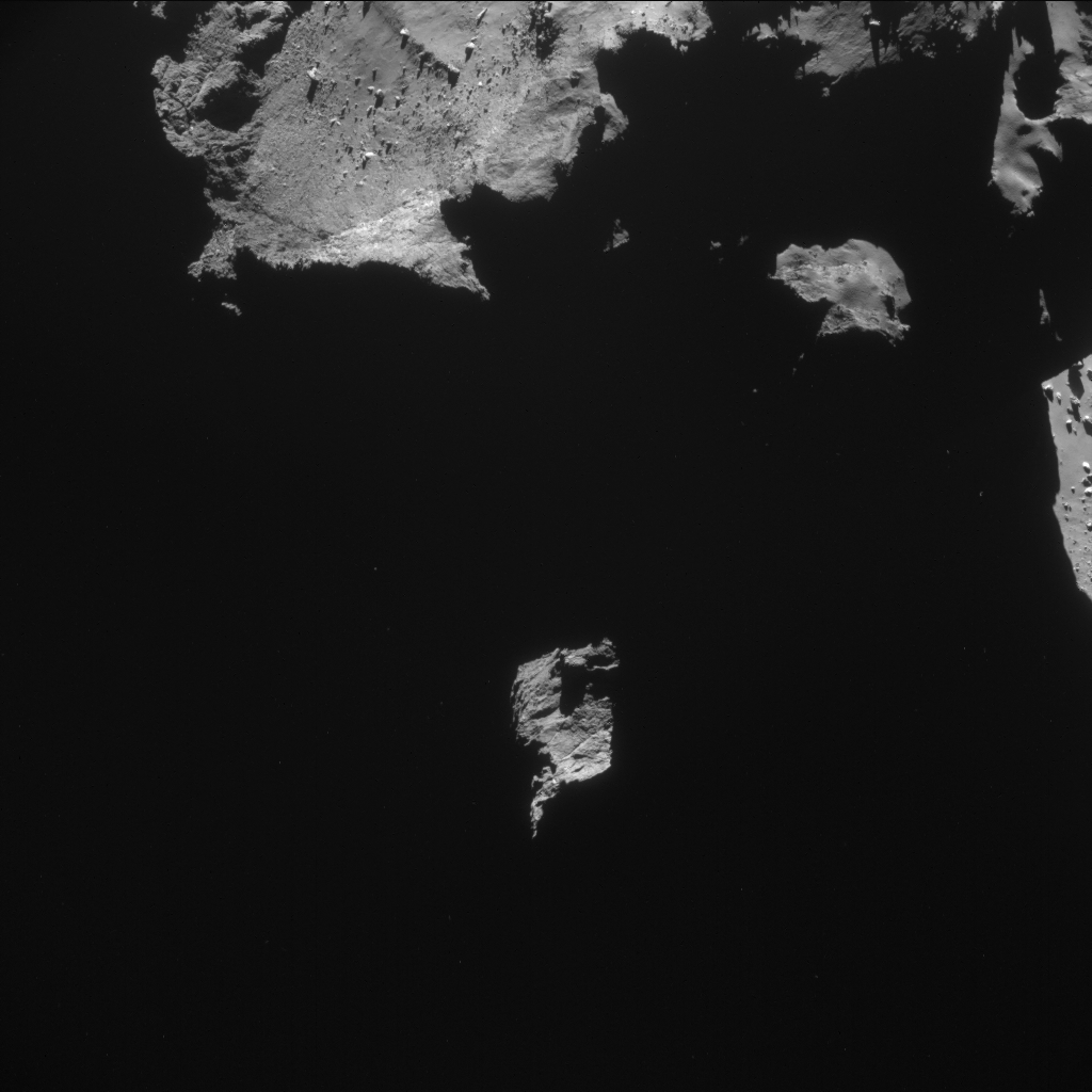 NAVCAM image sequences are now being taken as small 2×2 rasters and only part of the comet is seen in each of the four images. A montage of all four images from this sequence is available here and a mosaic of the four images stitched together is available here.