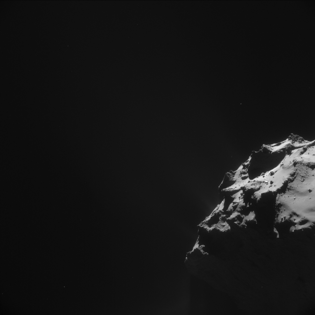 NAVCAM image sequences are now being taken as small 2×2 rasters and only part of the comet is seen in each of the four images. A montage of all four images from this sequence is available here and a mosaic of the four images stitched together is available here.