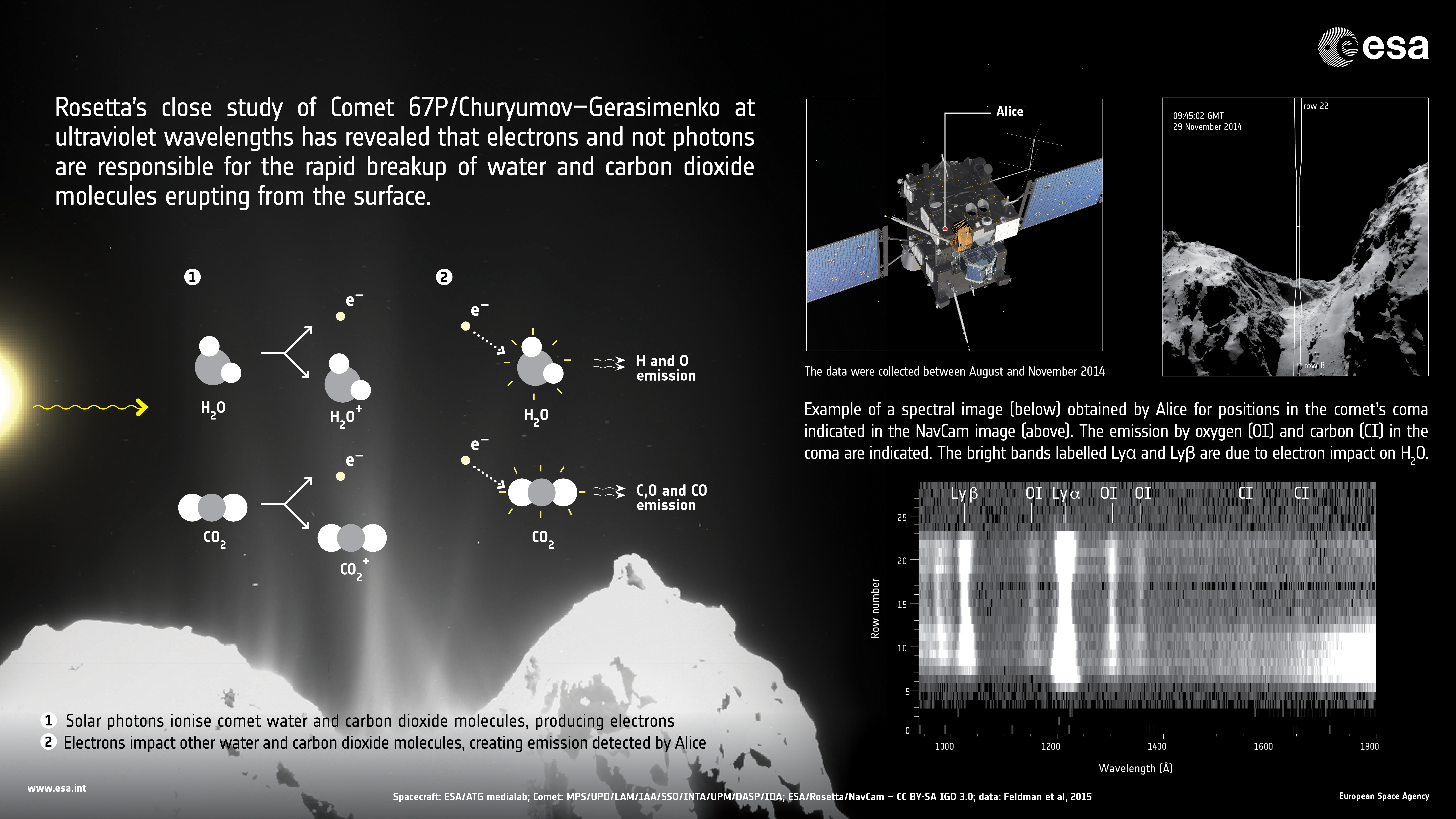 First, an ultraviolet photon from the Sun hits a water molecule in the comet's coma and ionises it, knocking out an energetic electron. This electron then hits another water molecule in the coma, breaking it apart into two hydrogen atoms and one oxygen, and energising them in the process. These atoms then emit ultraviolet light that is detected at characteristic wavelengths by Rosetta's Alice instrument.