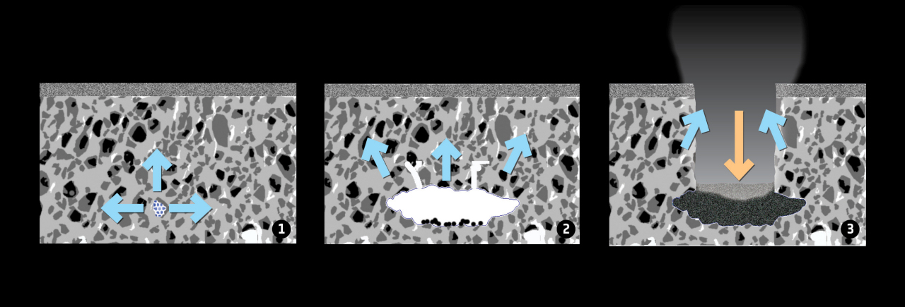 Graphic explaining how Comet 67P/Churyumov–Gerasimenko’s pits may form through sinkhole collapse. The graphic shows a dusty surface layer covering a mixture of dust and ices. 1. Heat causes subsurface ices to sublimate (blue arrows), forming a cavity (2). When the ceiling becomes too weak to support its own weight, it collapses, creating a deep, circular pit (3, red arrow). Newly exposed material in the pit walls sublimates, accounting for the observed activity (3, blue arrows).