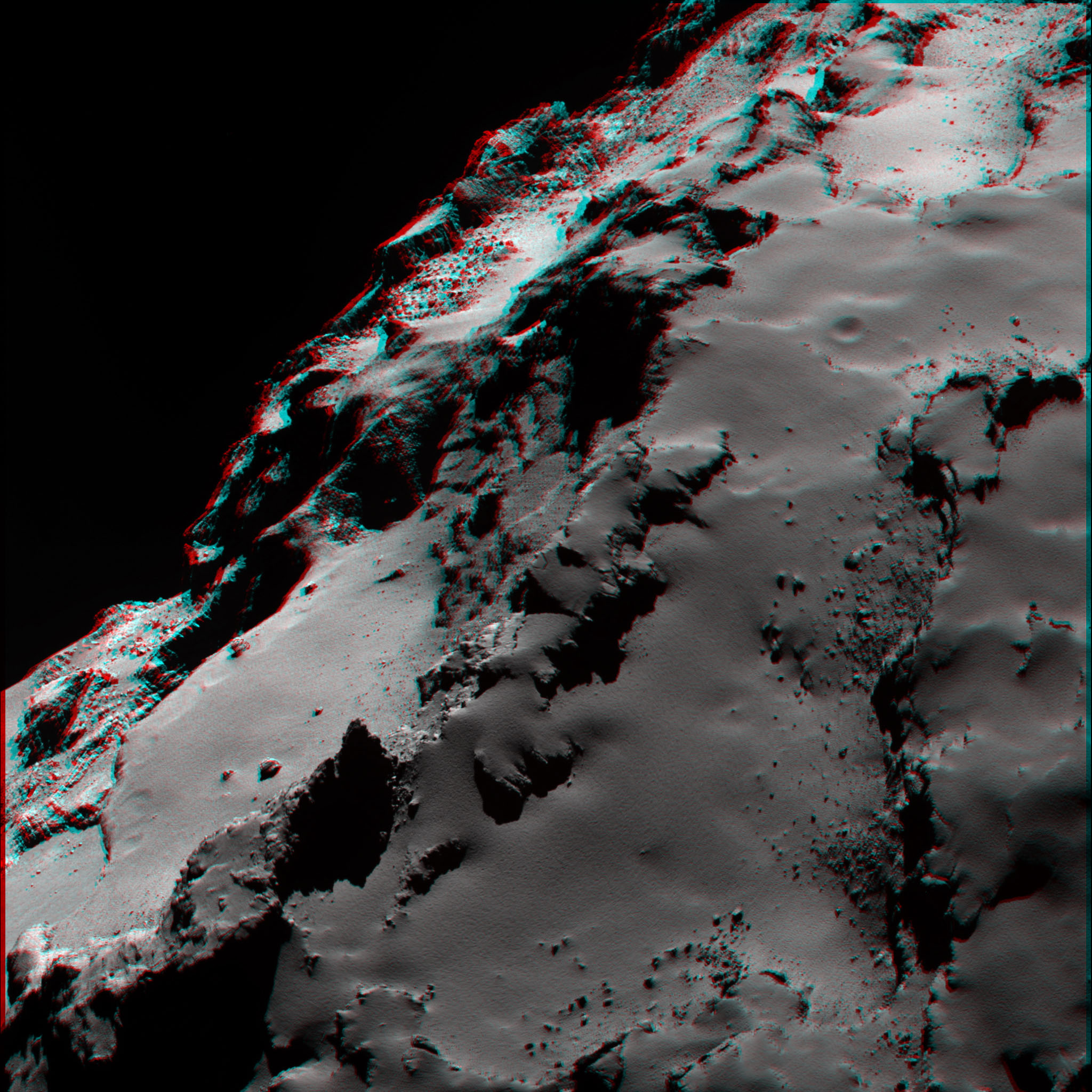 The image was created from two OSIRIS narrow-angle camera images taken less than one minute apart on 10 September 2014, when Rosetta was about 27 km from the surface of the comet. See here for non-anaglyph version.