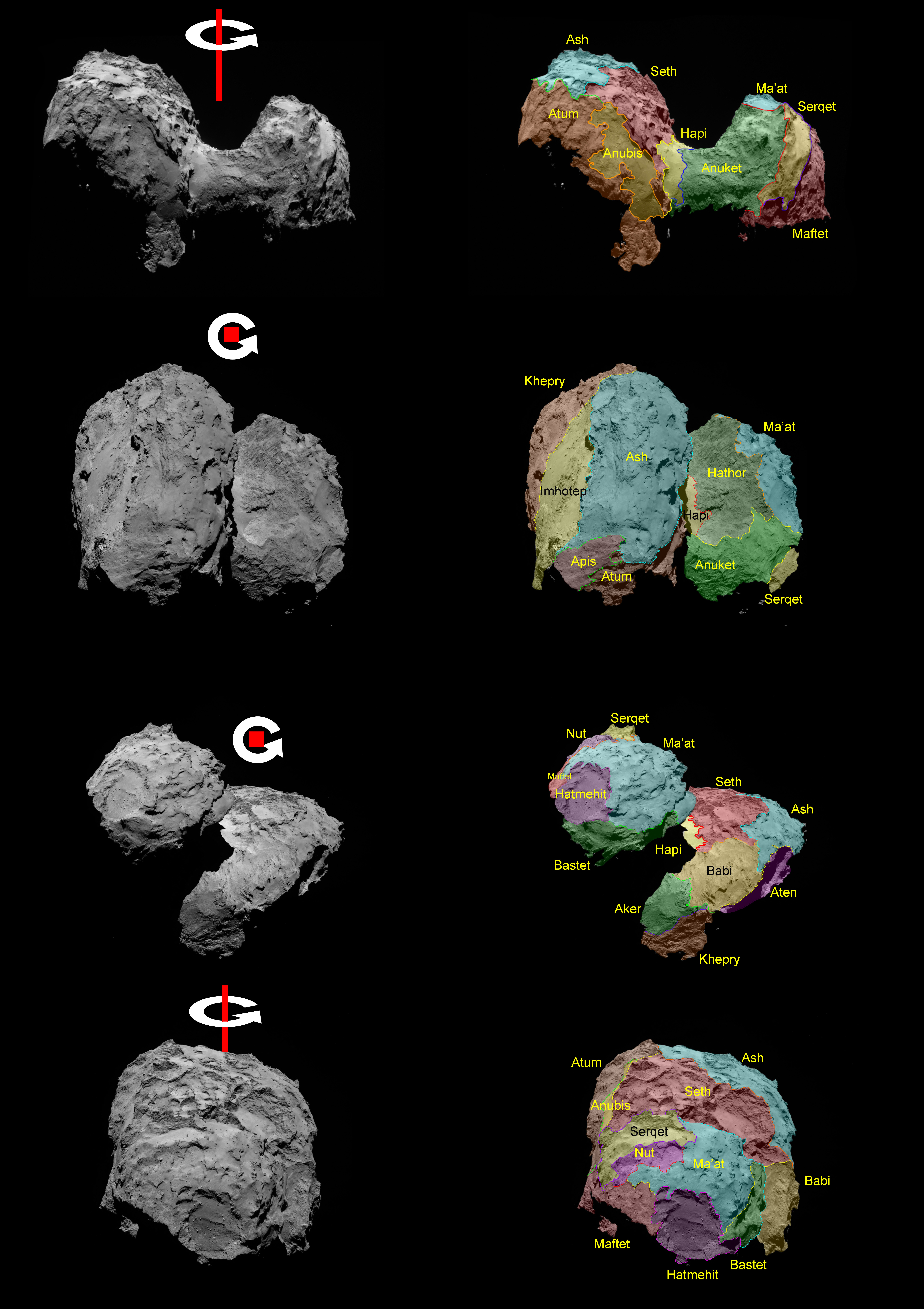 Left: OSIRIS images showing Comet 67P/Churyumov-Gerasimenko in different orientations. Rotation axes have been added; in the middle two panels the rotation axis is almost toward the viewer, that is, providing a north polar view.
