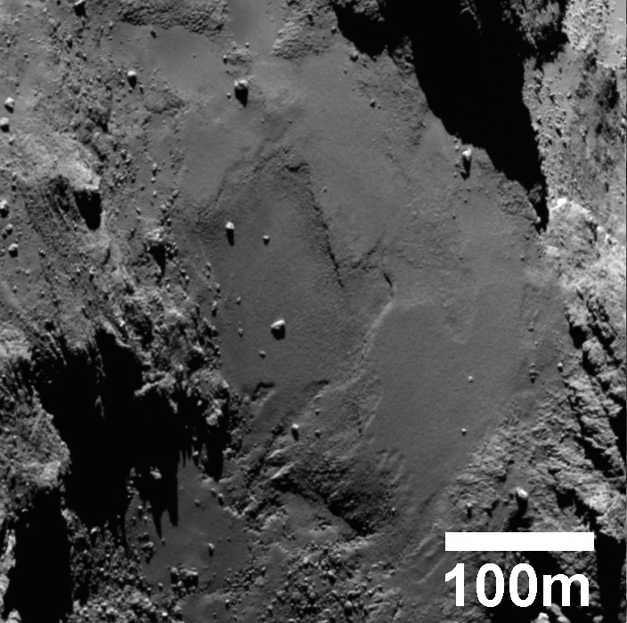 Close-up of the smooth-textured Anubis region on the large lobe of Comet 67P/Churyumov-Gerasimenko and the surrounding rough Atum region. The image was taken on 5 September 2014 from a distance of about 40 km from the surface.