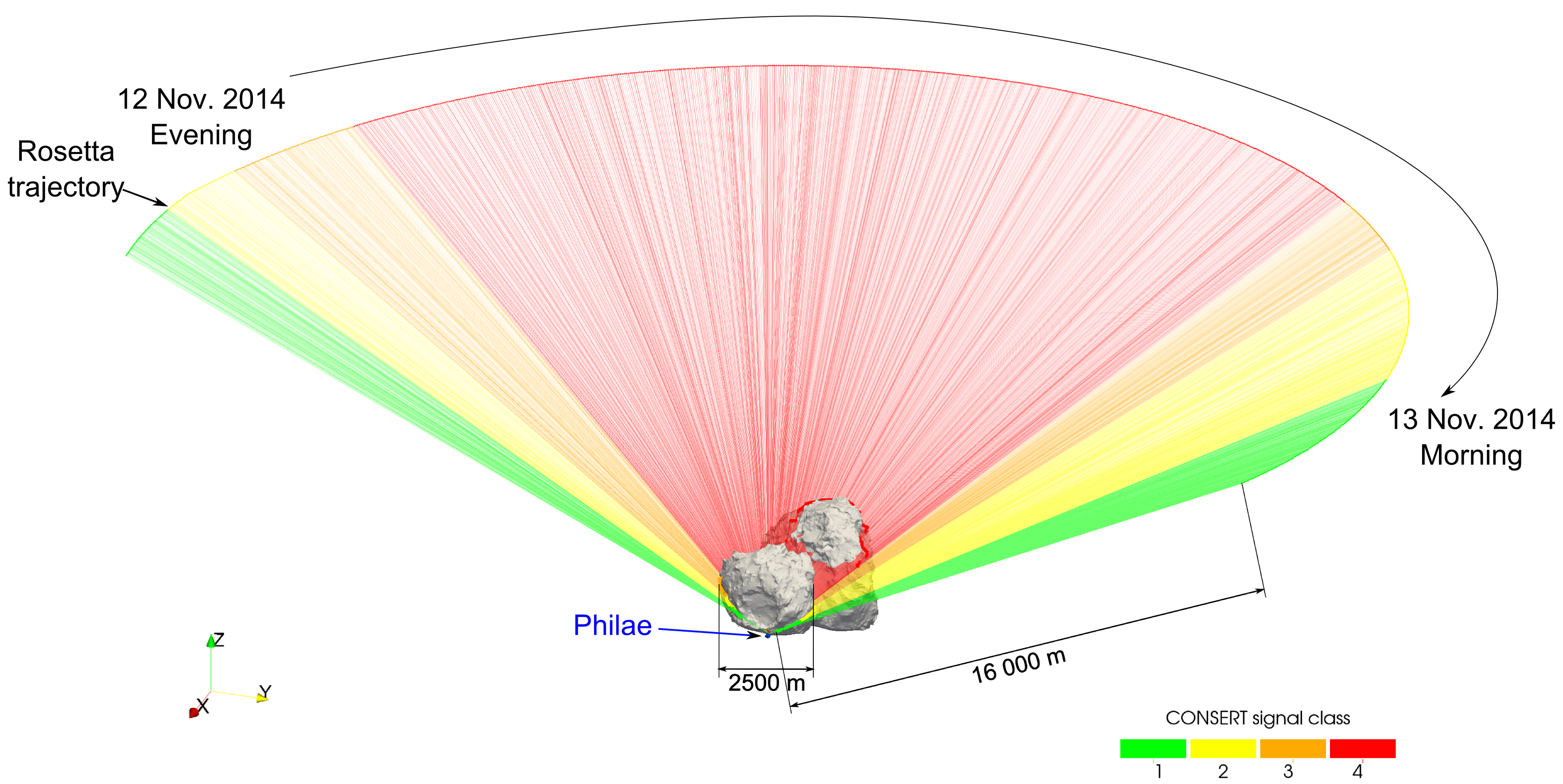 This diagram shows the propagation of signals between Rosetta and Philae through the nucleus of Comet 67P/Churyumov-Gerasimenko, between 12 and 13 November 2014. Green represents the best signal quality, decreasing in quality to red for no signal.