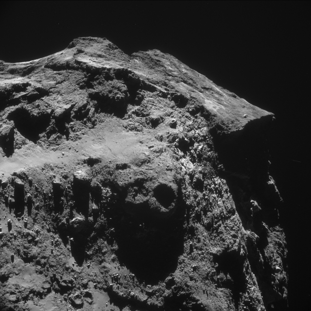 This image was captured on 14 December from a distance of 19.8 km from the comet centre and shows dramatic scenery on the comet's large lobe, at the boundaries of Imhotep (bottom part of the scene), Apis (including part of the flat surface and shadowed region towards top right) and Ash (top left). The image has a scale of 1.7 m/pixel and the image measures 1.7 km across.