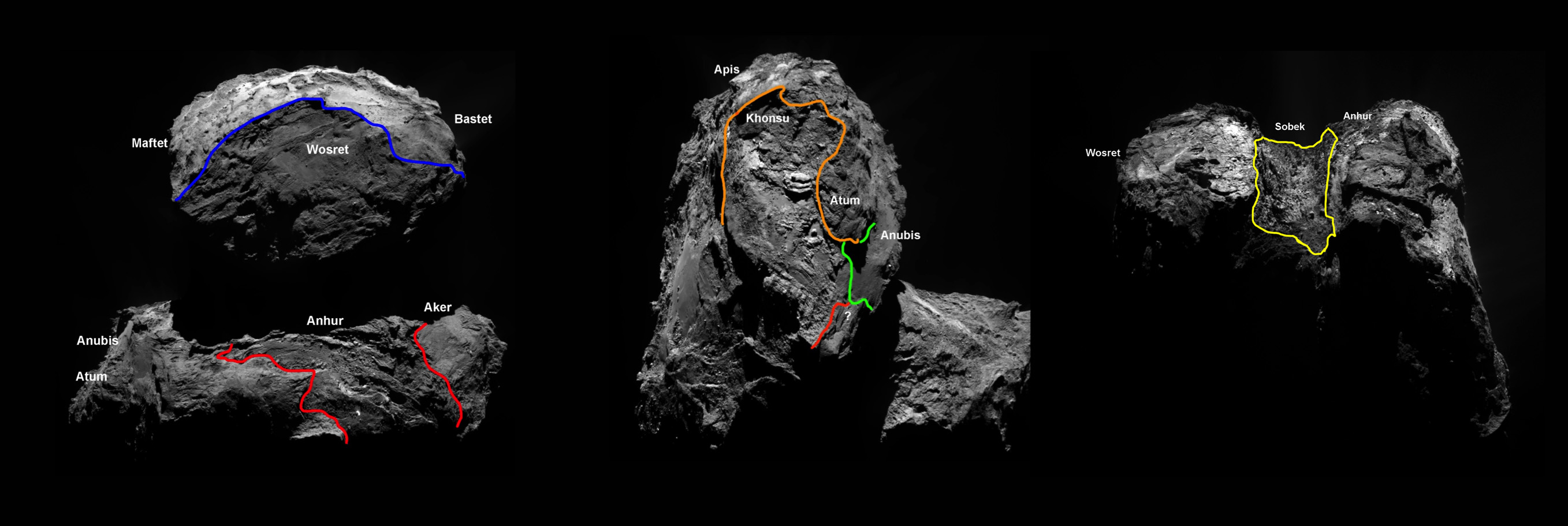 This allowed scientists to fill in some of the missing pieces of the comet's regional map. Like the 19 regions that had been identified in January 2015, the four new ones are named for Egyptian deities, following the ancient Egyptian theme of the Rosetta mission: Anhur, Khonsu, Sobek and Wosret. Anhur and Khonsu can be found on the underside of the comet's larger lobe, Wosret on the smaller lobe, and Sobek is located on the comet's neck.