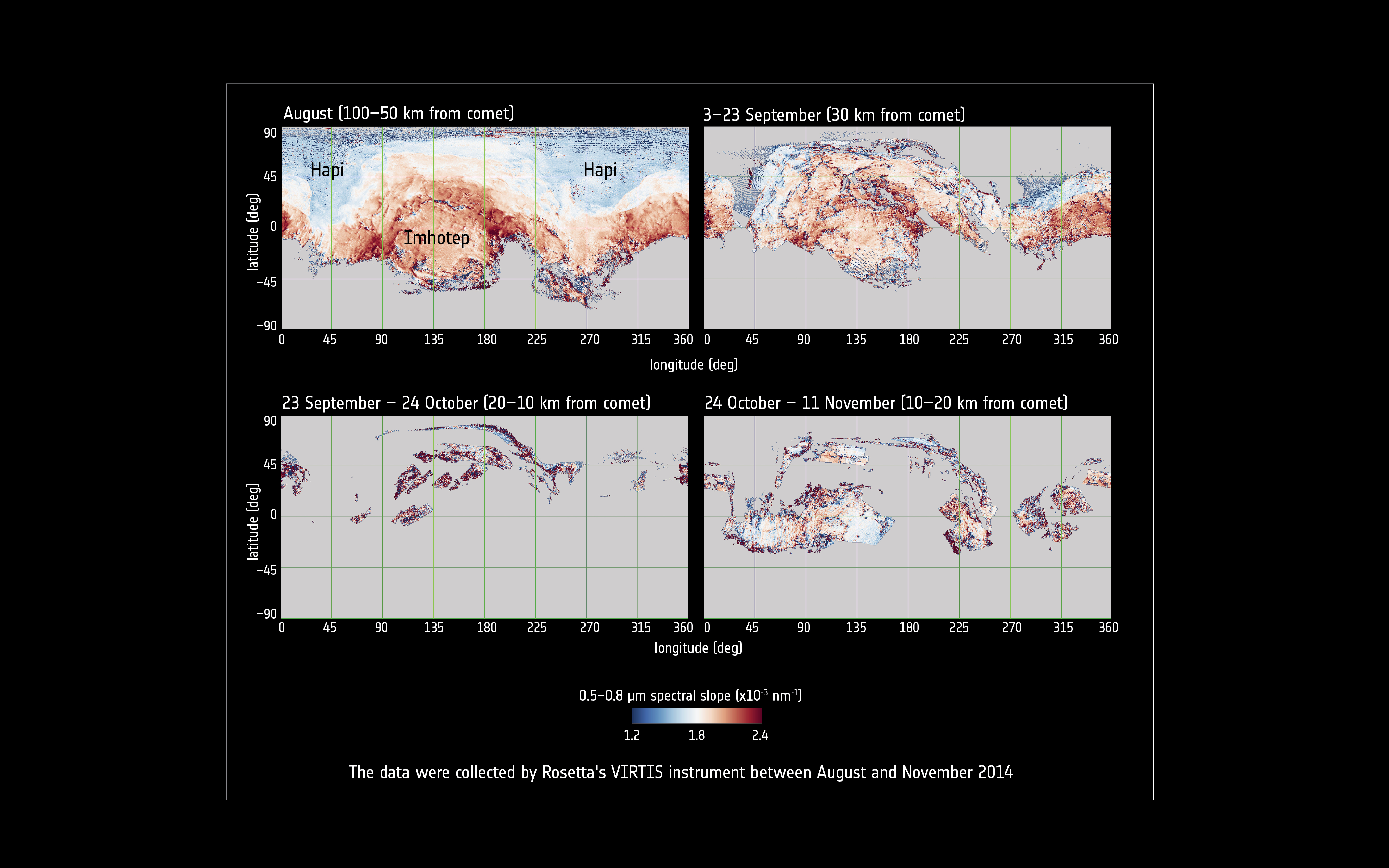 The VIRTIS study shows that even in the first three months of study at the comet, global average changes are noticeable, with an overall trend of the comet becoming brighter and more water-ice-rich. This is particularly notable in the Imhotep region, which becomes overall bluer over time.