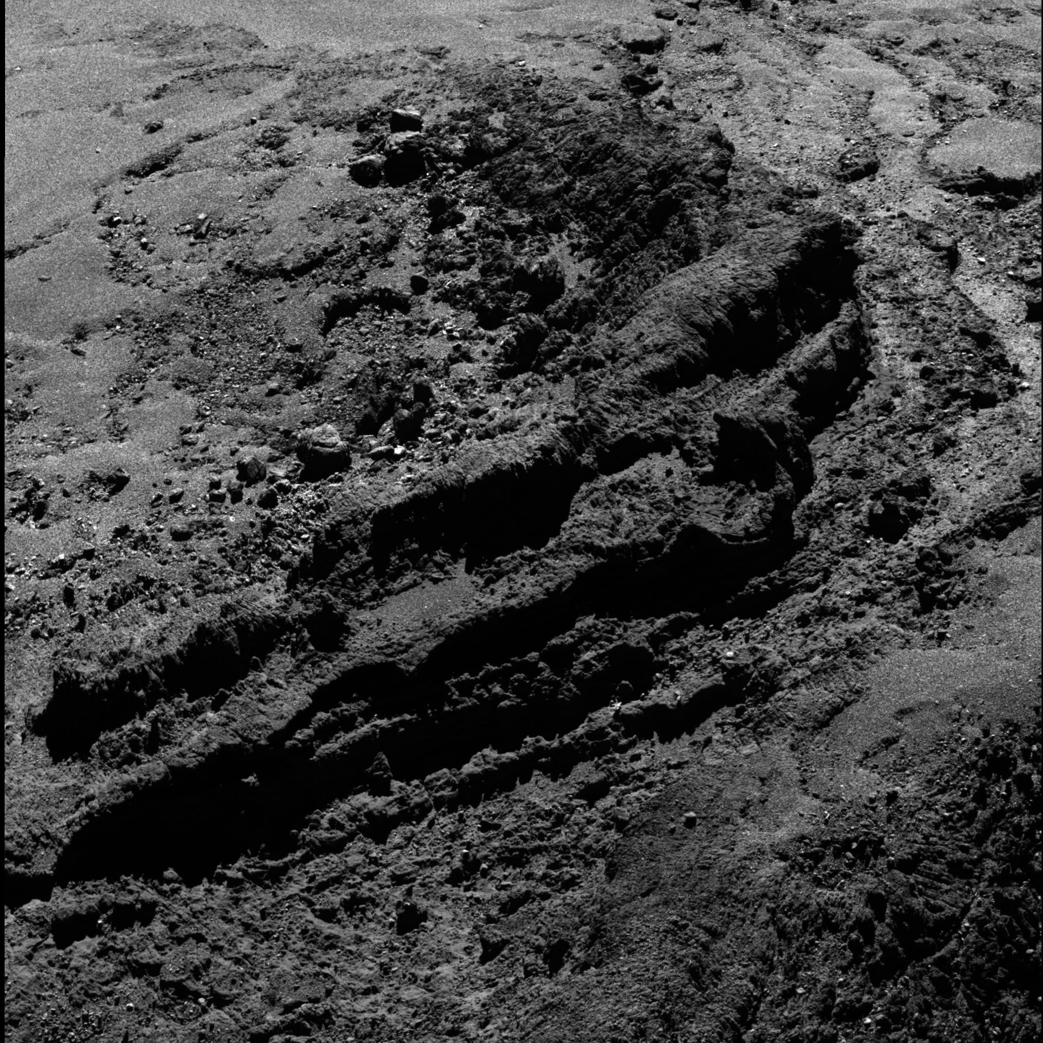OSIRIS narrow-angle camera (NAC) image taken on 19 March 2016, when Rosetta was 12 km from the nucleus of comet 67P/Churyumov-Gerasimenko. The scale is 20 cm/pixel.