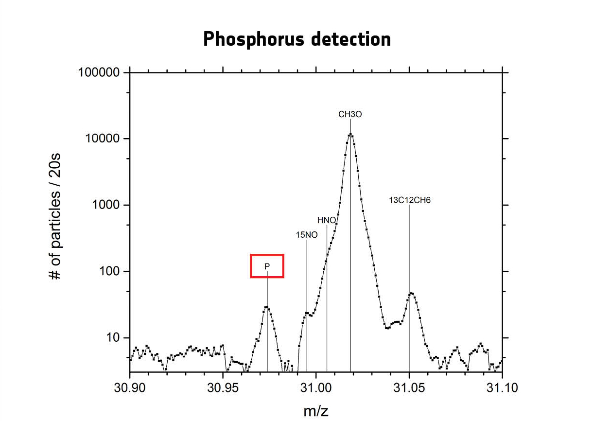 Spectrum indicating phosphorus (P) detection, along with other gases, on 26 October 2014. Phosphorus is a key element in all living organisms. It is found in DNA, RNA and in cell membranes, and it is used in transporting chemical energy within cells for metabolism.