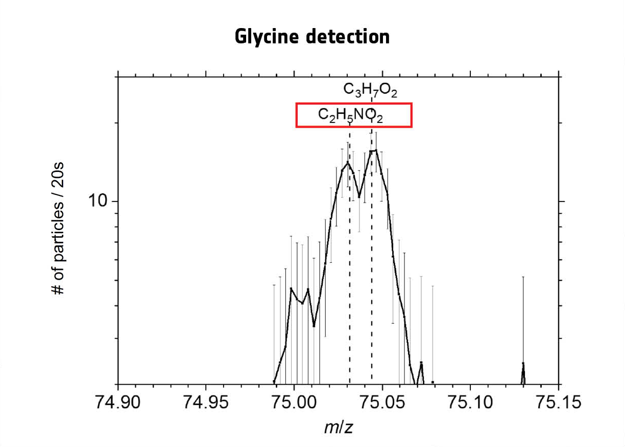 Spectrum indicating glycine (C2H5NO2) detection on 9 July 2015. The simple amino acid glycine is a biologically important organic compound commonly found in proteins.