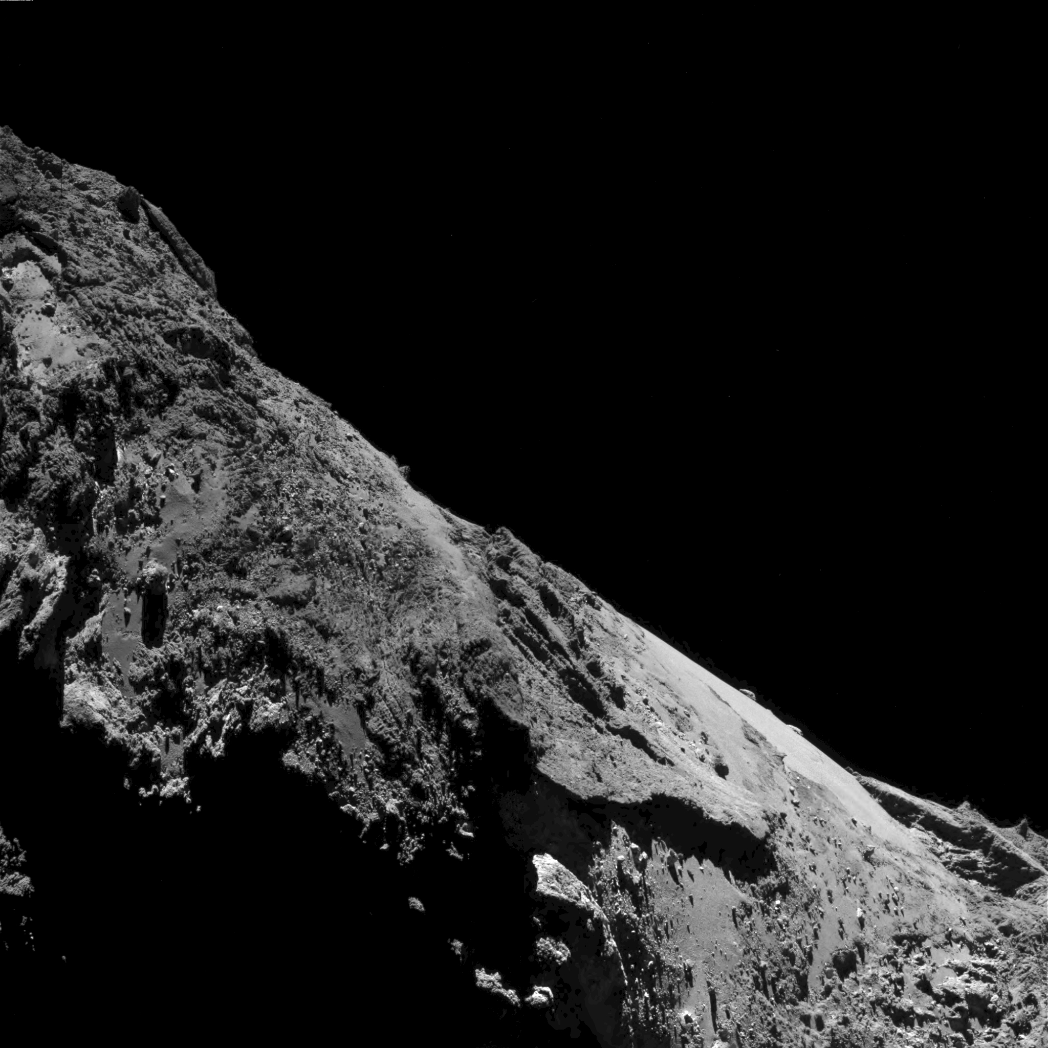 OSIRIS wide-angle camera (WAC) image taken on 17 May 2016, when Rosetta was 9.4 km from the nucleus of comet 67P/Churyumov-Gerasimenko. The scale is 89 cm/pixel.