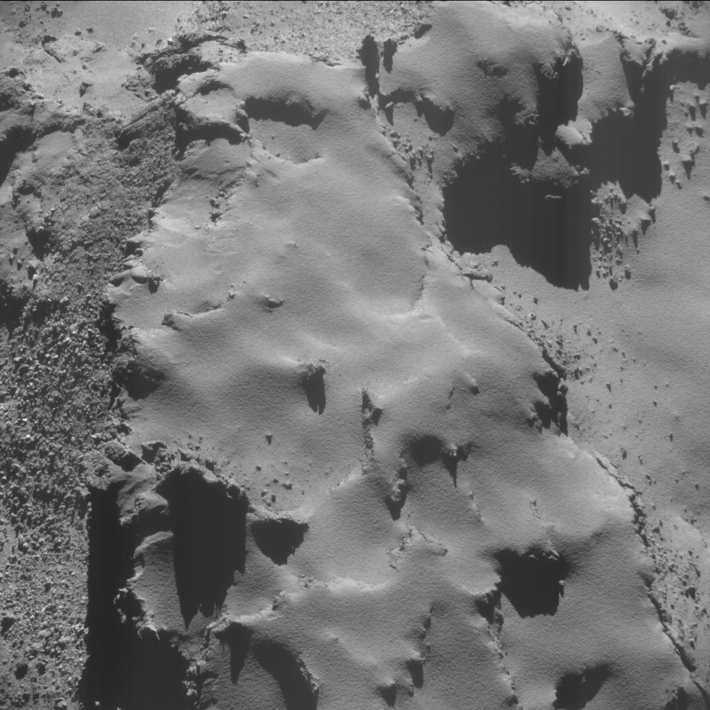 Rosetta navigation camera (NavCam) image taken on 18 July 2016 at 9.5 km from the centre of comet 67P/Churyumov-Gerasimenko, or about 8 km from the surface in this view. The image measures 0.7 km across and has a scale of about 0.7 m/pixel.