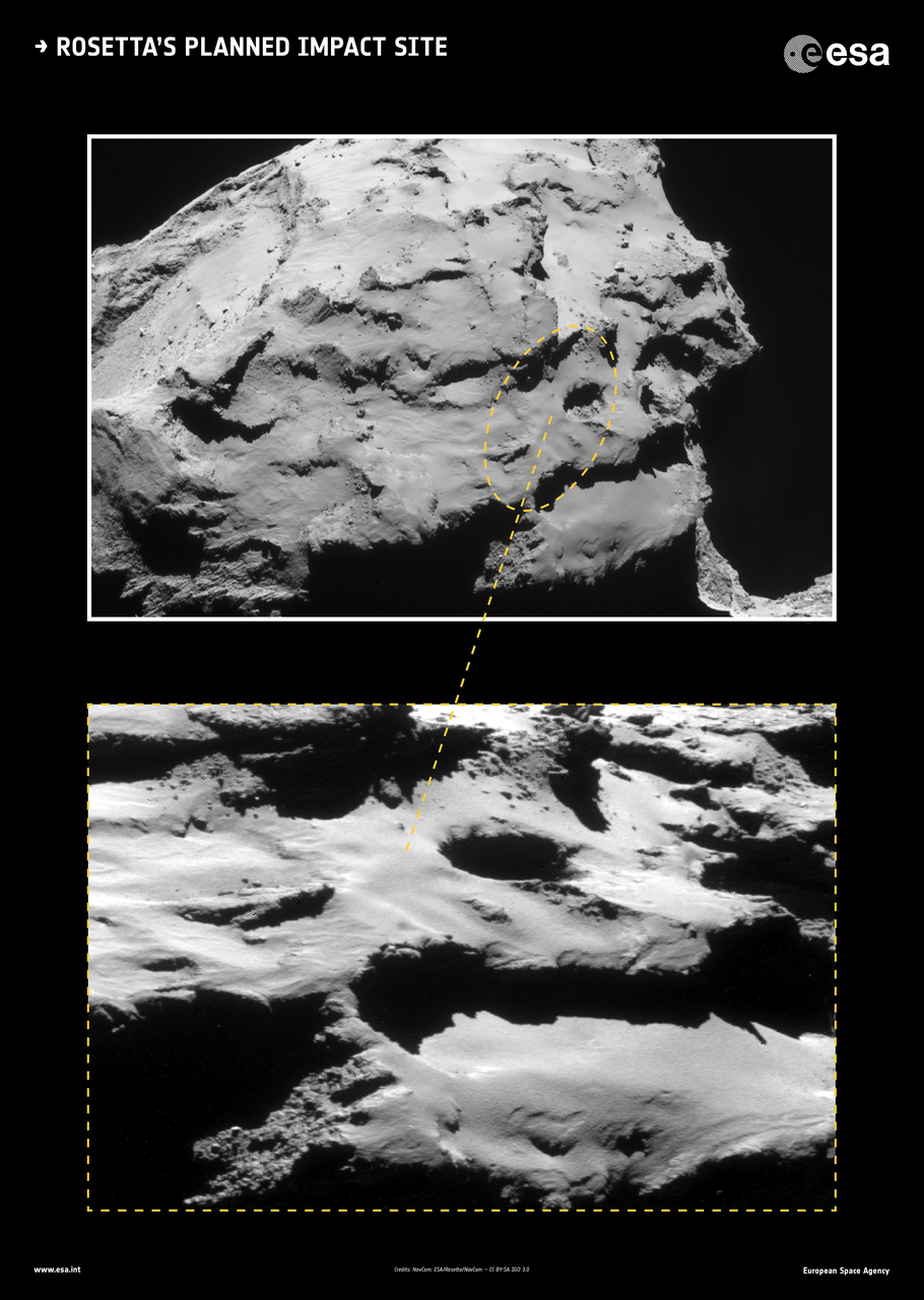 Rosetta is destined to make a controlled impact into the Ma'at region of Comet 67P/Churyumov–Gerasimenko on 30 September 2016, targeting a point within a 700 × 500 m ellipse (a very approximate outline is marked on the image).