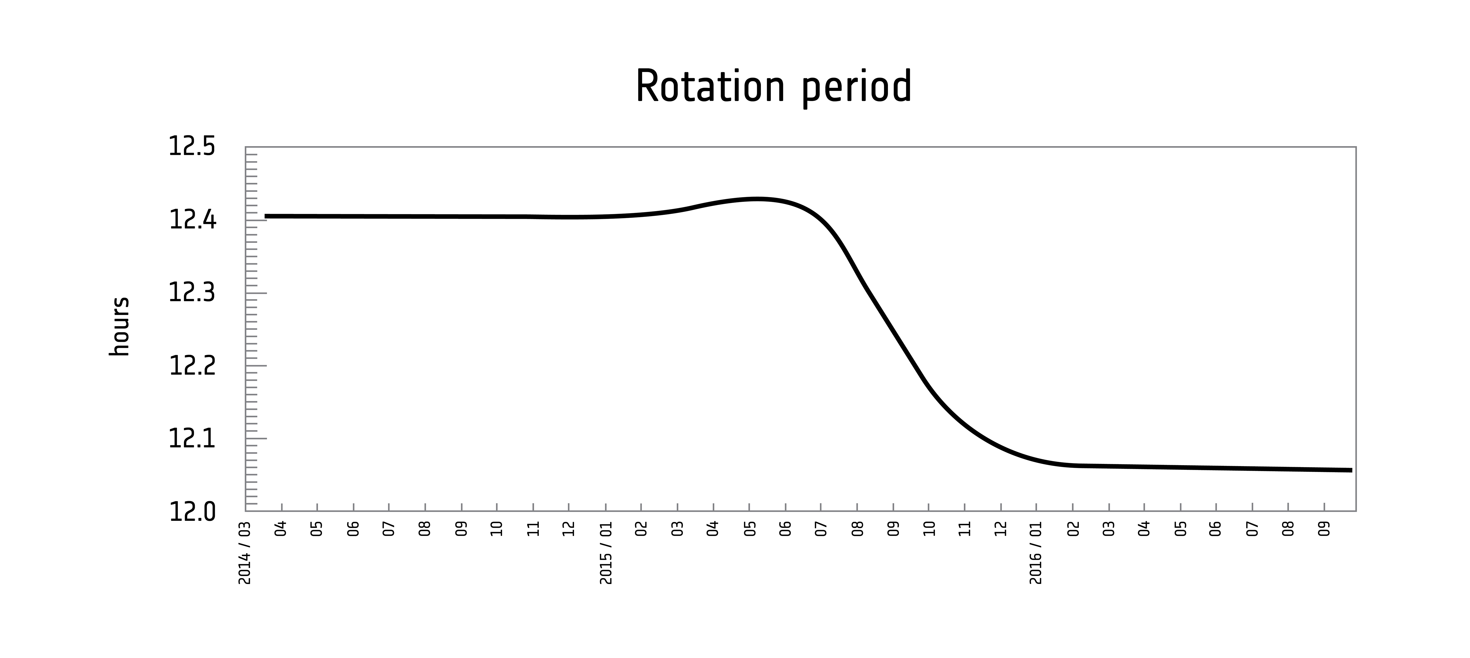 The first measurements are from March 2014: at that time the comet completed one rotation in 12.404 hours (12 hours 24 minutes 14 seconds).