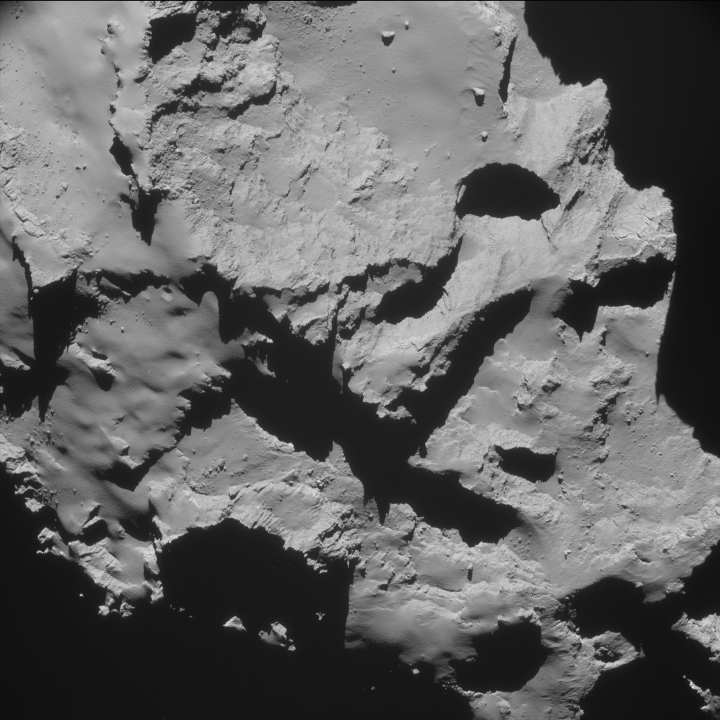 Rosetta navigation camera (NavCam) image taken on 29 September 2016 at 19.4 km from the centre of comet 67P/Churyumov-Gerasimenko. The image measures 1.7 km across and has a scale of about 1.7 m/pixel.