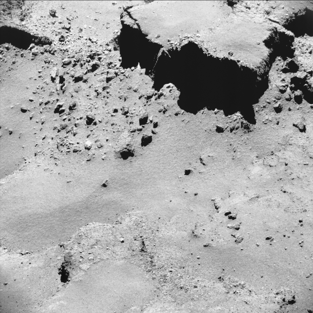 Rosetta navigation camera (NavCam) image taken on 11 September 2016 at 4.5 km from the centre of comet 67P/Churyumov-Gerasimenko, or about 3.5 km from the surface in this view. The image measures 310 m across and has a scale of about 0.3 m/pixel. This is one of the three closest images taken by NavCam. Additional details and a context image are in this Rosetta blog post.