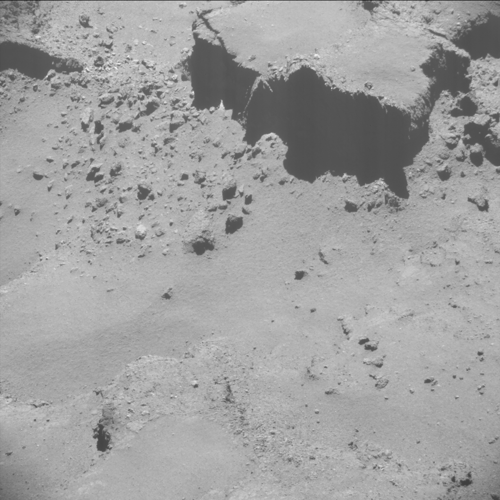 Rosetta navigation camera (NavCam) image taken on 11 September 2016 at 4.5 km from the centre of comet 67P/Churyumov-Gerasimenko, or about 3.5 km from the surface in this view. The image measures 310 m across and has a scale of about 0.3 m/pixel. This is one of the three closest images taken by NavCam. Additional details and a context image are in this Rosetta blog post.