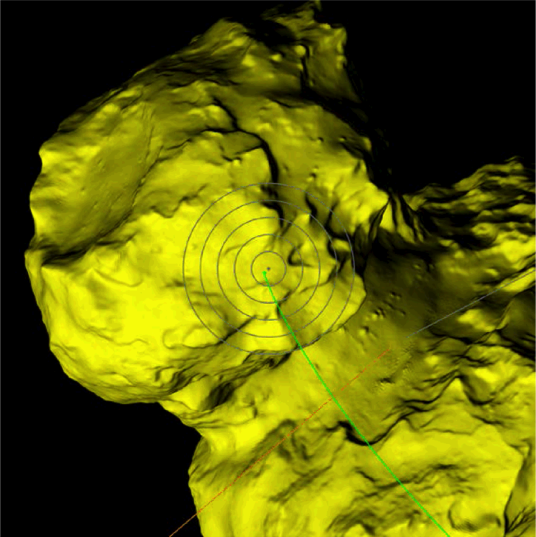 Rosetta touched down just 33 m away from the target point, as indicated by the green descent trajectory line. The inner circle has a radius of 50 m and the concentric circles around the centre are spaced by increments of 50 m.