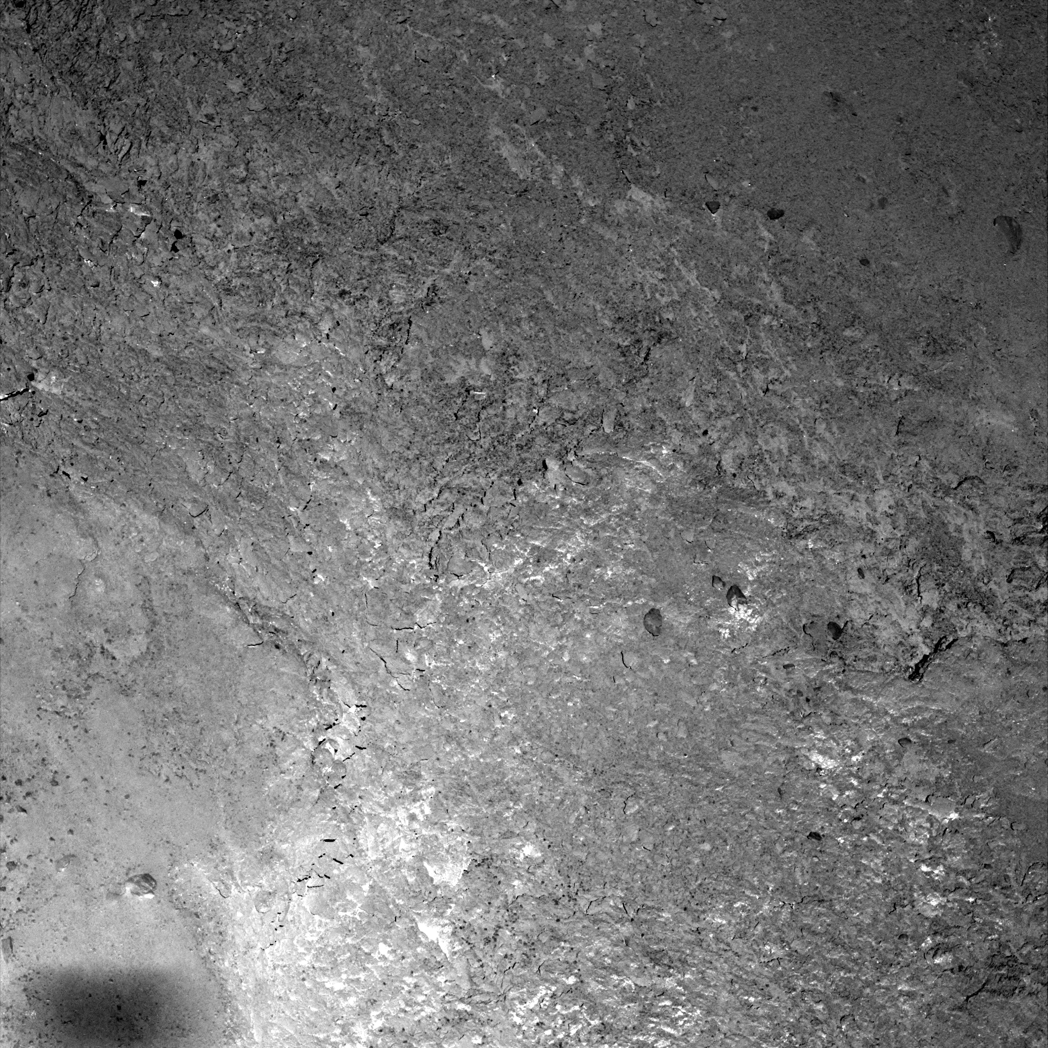 As a side effect, Rosetta's shadow could also be seen, cast on the surface of the comet as a fuzzy rectangular dark smudge somewhat larger than Rosetta itself, in this case measuring some 20 × 50 m. The full image measures about 228 m across.